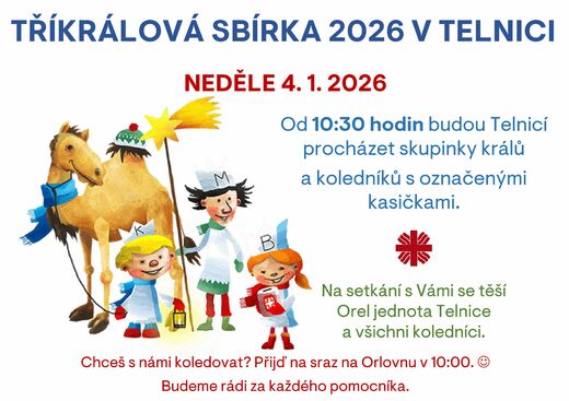 28. 12. 2025Tříkráloví koledníci se tentokrát v Telnicxi vydají do ulic v neděli 4. ledna 2026 v 10:30 hod.... Více