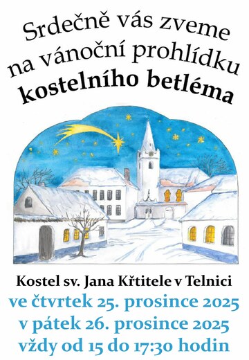 21. 12. 2025Ve čtvrtek 25.12. a v pátek 26.12.2025 srdečně zveme na prohlídku betléma v telnikcém kostele. Prohlídka bude možná vždy od 15:00 do 17:30... Více