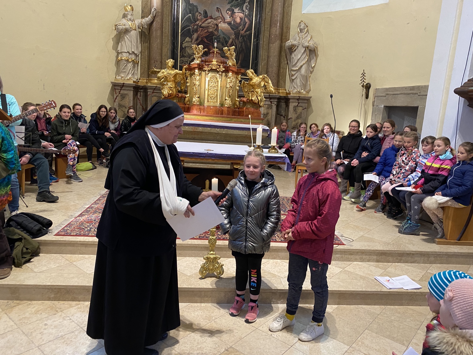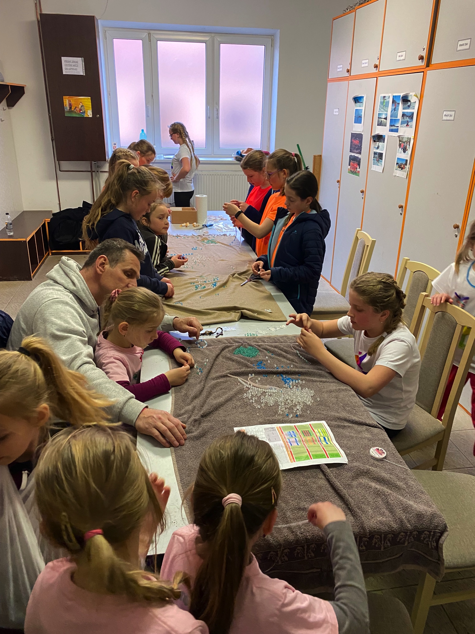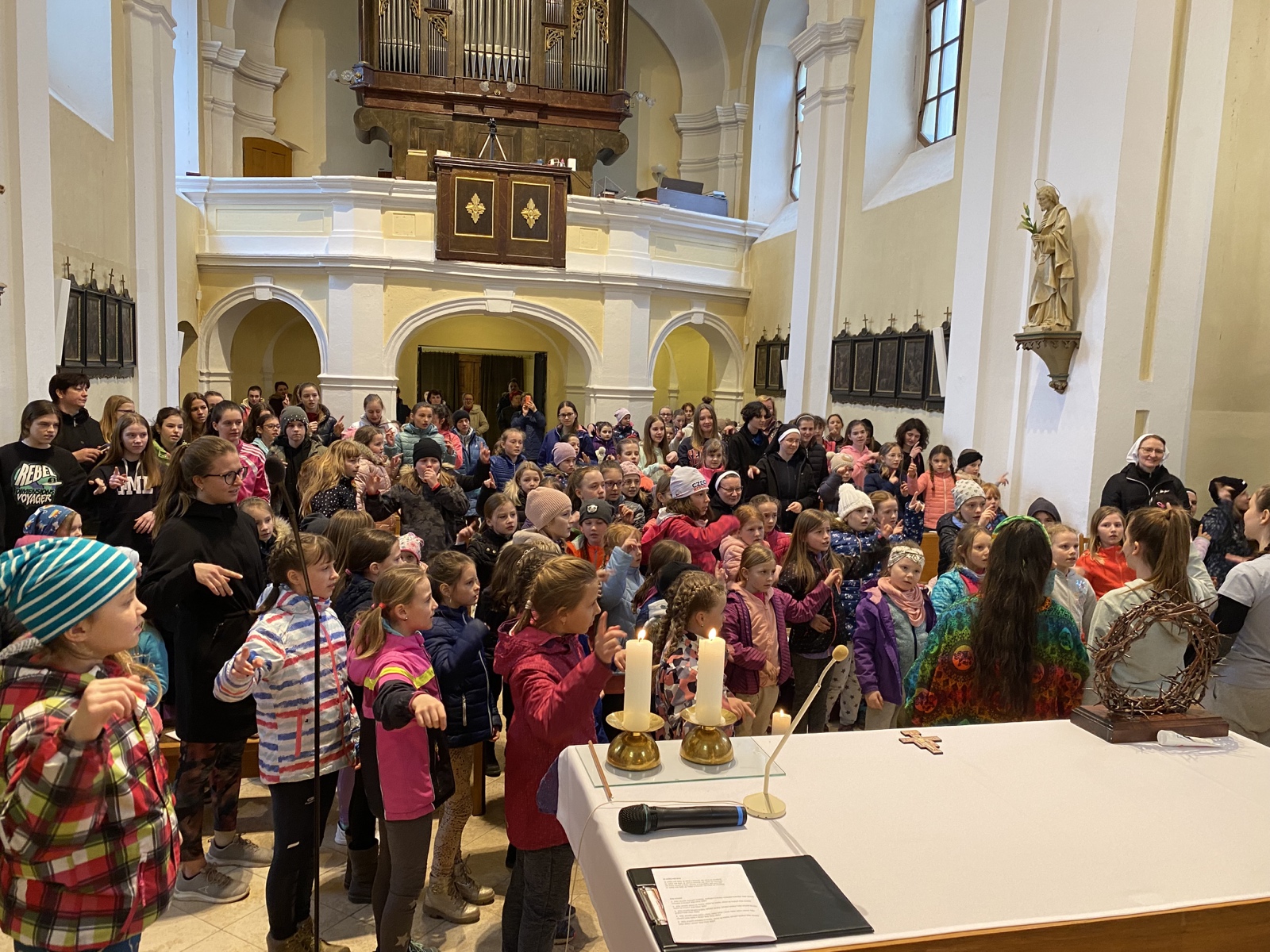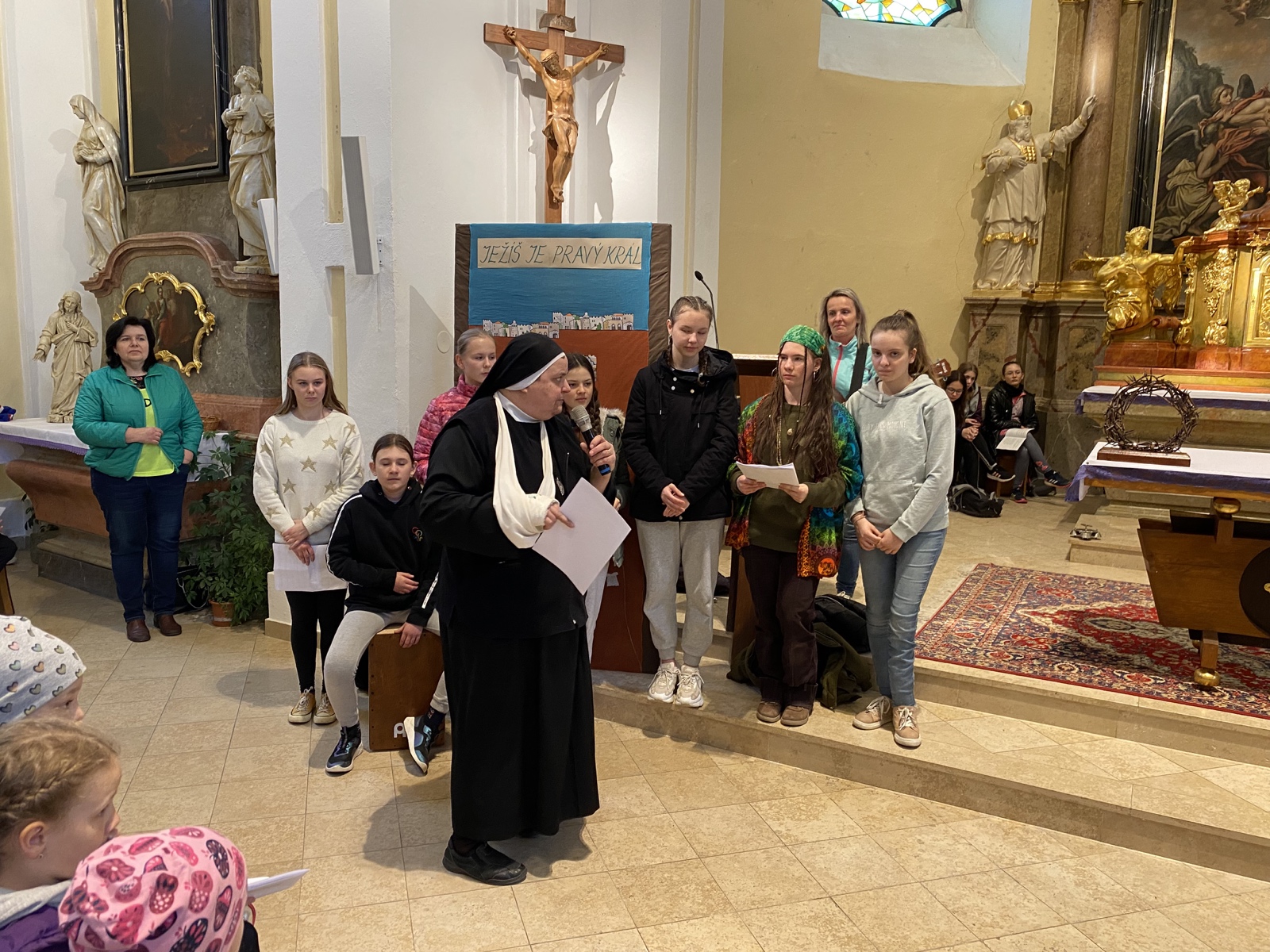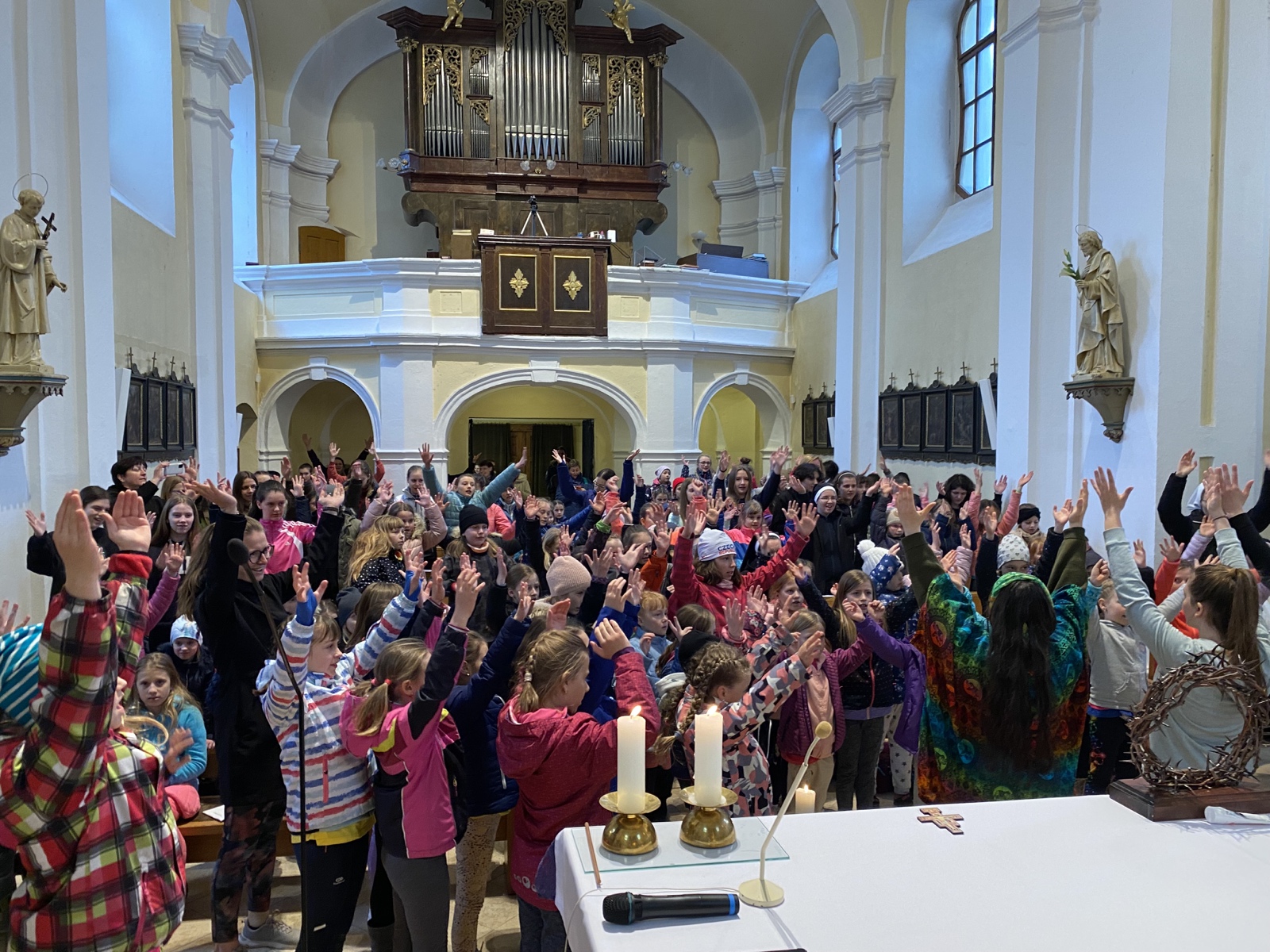 V poledne se děvčata sešla v sále Sokolovny, kde se společně najedla z připravených dobrot, kterém jim sem přinesly jejich maminky či babičky. Bylo to moc dobré, děkujeme! Po obědě se pak společným průvodem vydala do farního kostela, kde řádová sestra Františka z Rajhradu vyprávěla o svém svědectví z jihoamerických misií. Zároveň si každý tým připravil jednu chválu a společně si všichni zazpívali. Setkání v chrámě mělo skutečně úžasnou atmosféru…