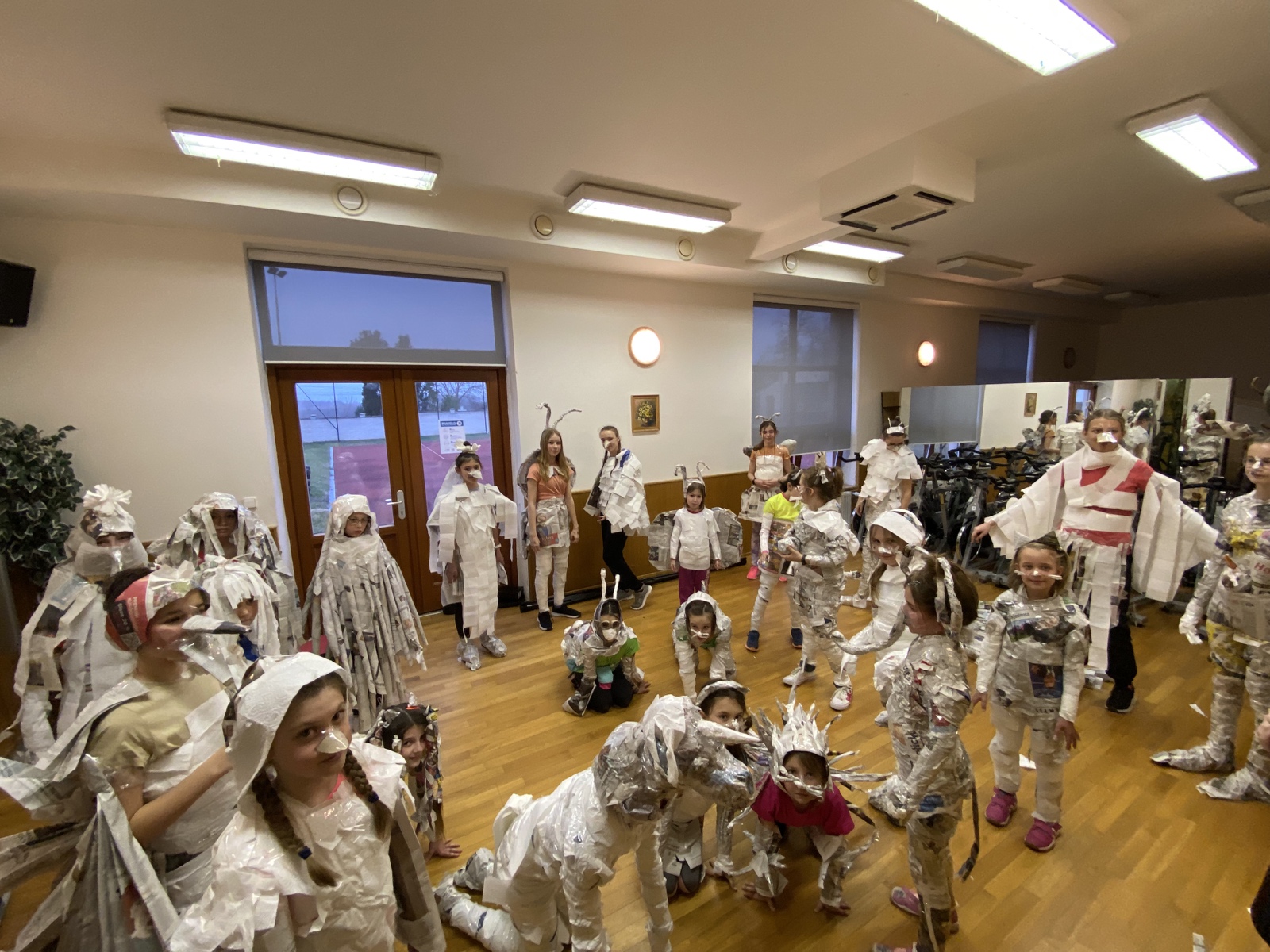 Po obědě si pak program mladší a starší týmy vyměnily, takže olympijskou štafetu si užily zase pro změnu družstva I. stupně ZŠ. Po páté hodině odpolední se všichni sešli na Orlovně, kde proběhl finálový večerní program. Nejdříve se předvedly nejlepší týmy v Taneční show, pak také dva nejlepší „vypravěči příběhů“ z každé kategorie a také nominované nejoriginálnější tanečnice z každého týmu. Jako tradičně celodenní program vrcholil módní přehlídkou, bez které si už naši olympiádu neumíme ani představit: z toaletního papíru a starých novin a za pomoci izolepy jednotlivé tým vyzdobily své reprezentantky do podoby zvířátek. Naše malá „živá papírová ZOO“ se pak následně postupně prezentovala na podiu velkého sálu Orlovny. To bylo potlesku a nadšení! Úkolem odborné poroty (měnínský a blučinský pan farář P. Jaroslav Trávníček, sestra Františka, starostka Sivic Marie Kousalová, místostarosta Telnice Jan Dudák a Kristýna Hoffmanová z Viničných Šumic) bylo vybrat tři nejkrásnější zvířátka z každé kategorie. Byl to ale skutečně složitý úkol, když všichni viděli tu parádu, kreativitu a úsilí talentovaných módních návrhářek!