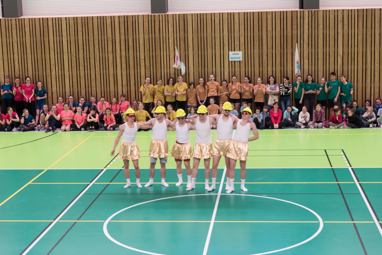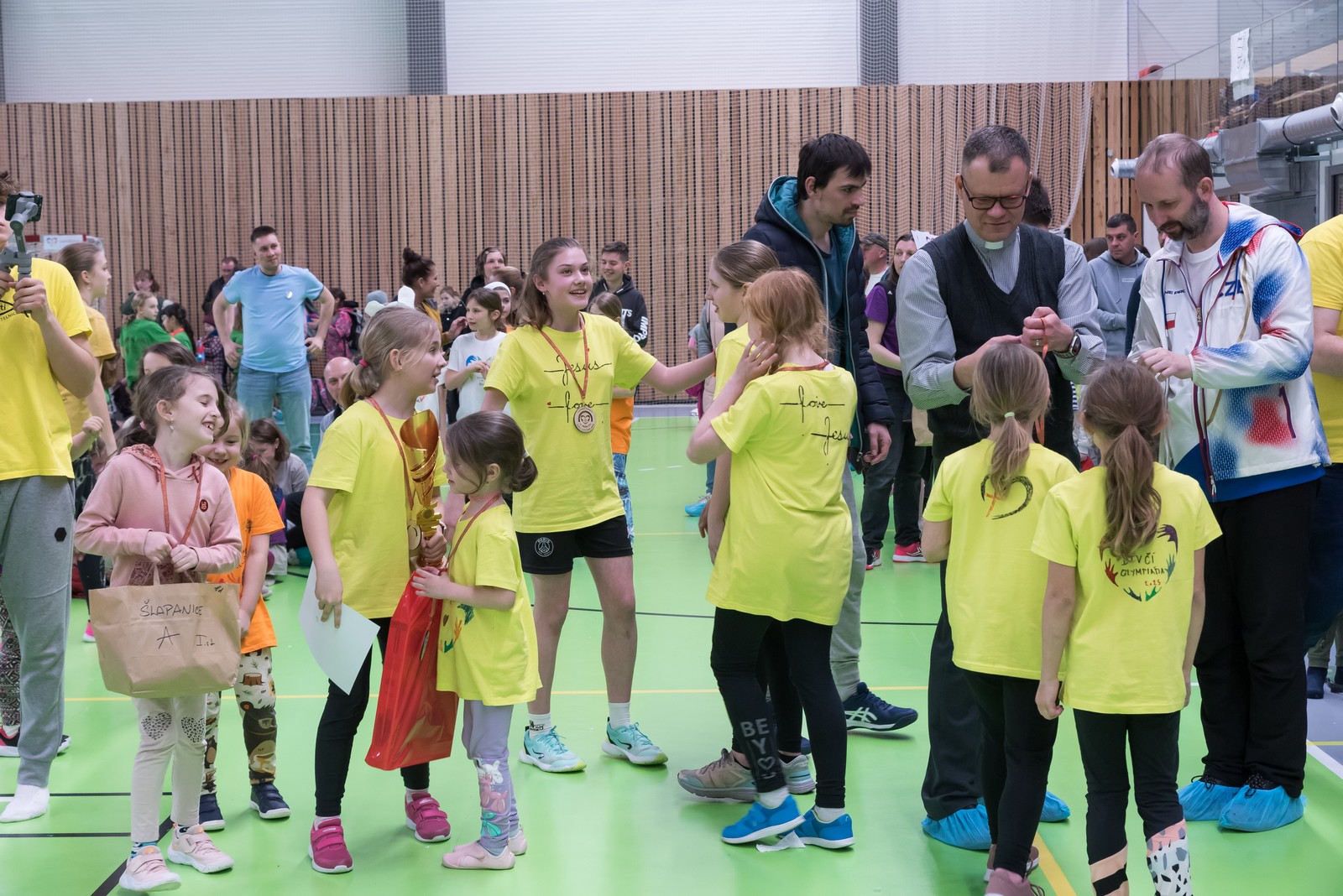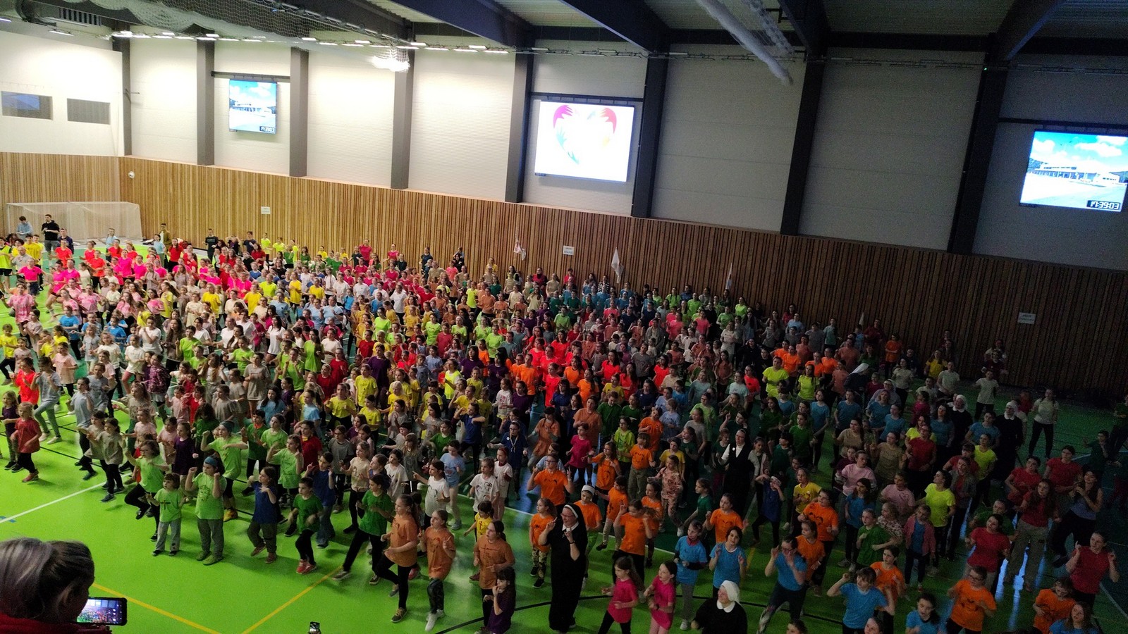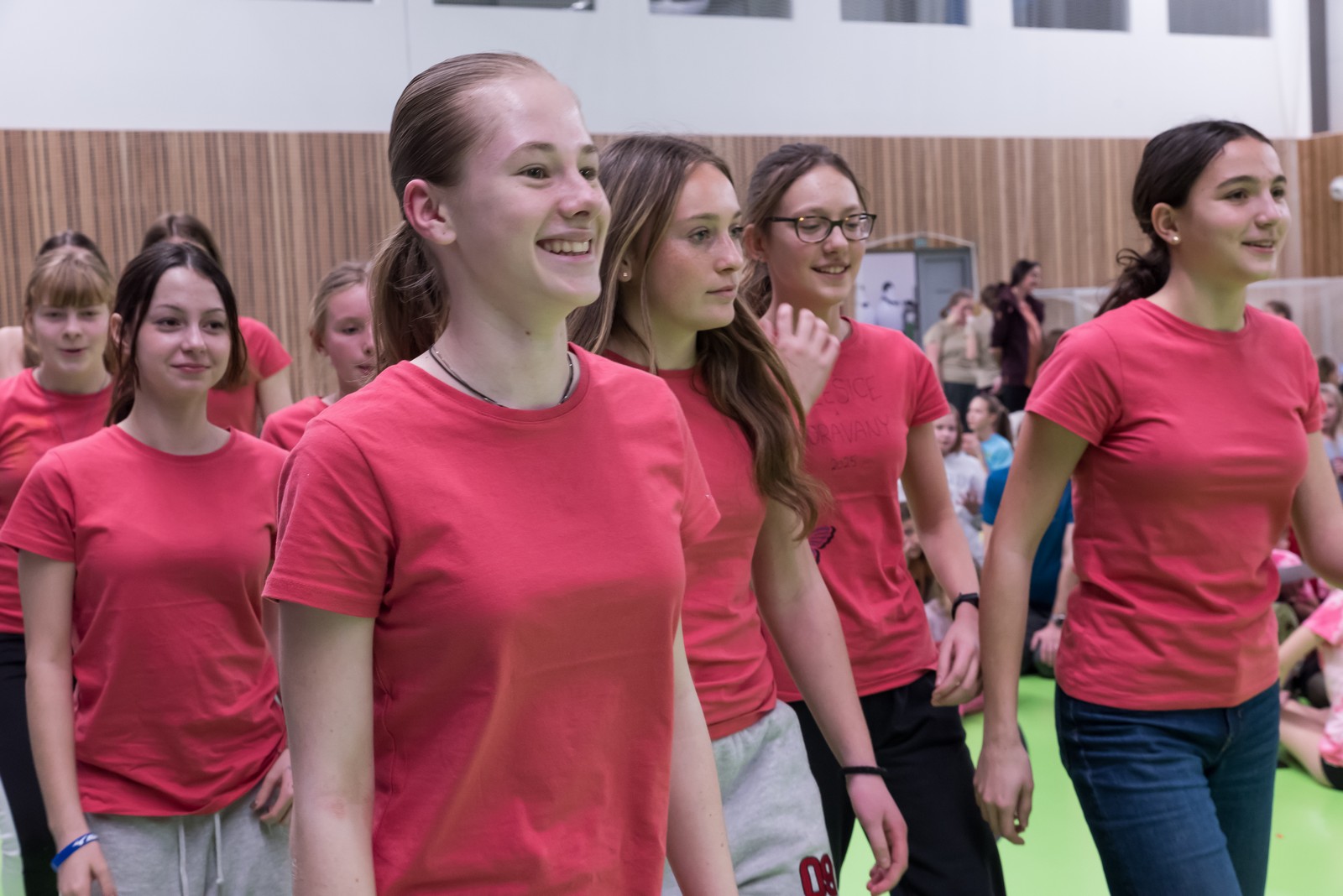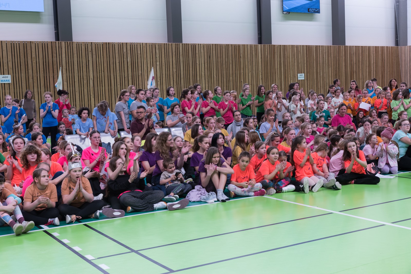 Na hrací plochu následně přišly mladé pardálky, aby zatancovaly svou verzi tance just dance, který si nacvičily během odpoledního programu v Měníně. Po nich své tance předvedla hromadně také děvčata obou zbývajících věkových kategorií, přičemž u tance nejmladších olympioniček byli na „taneční parket“ přivoláni také všichni přítomní, včetně kněží a řádových sester. Teď už snad tančila i hala za zvuku písničky: „Každý svůj pohyb dělám v Tobě, Ježíši“. Vytvořený lidský had neměl konce, radost tudy proudila na každém kroku…