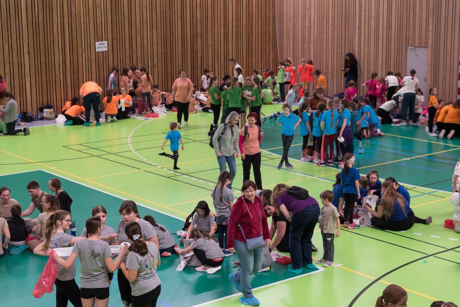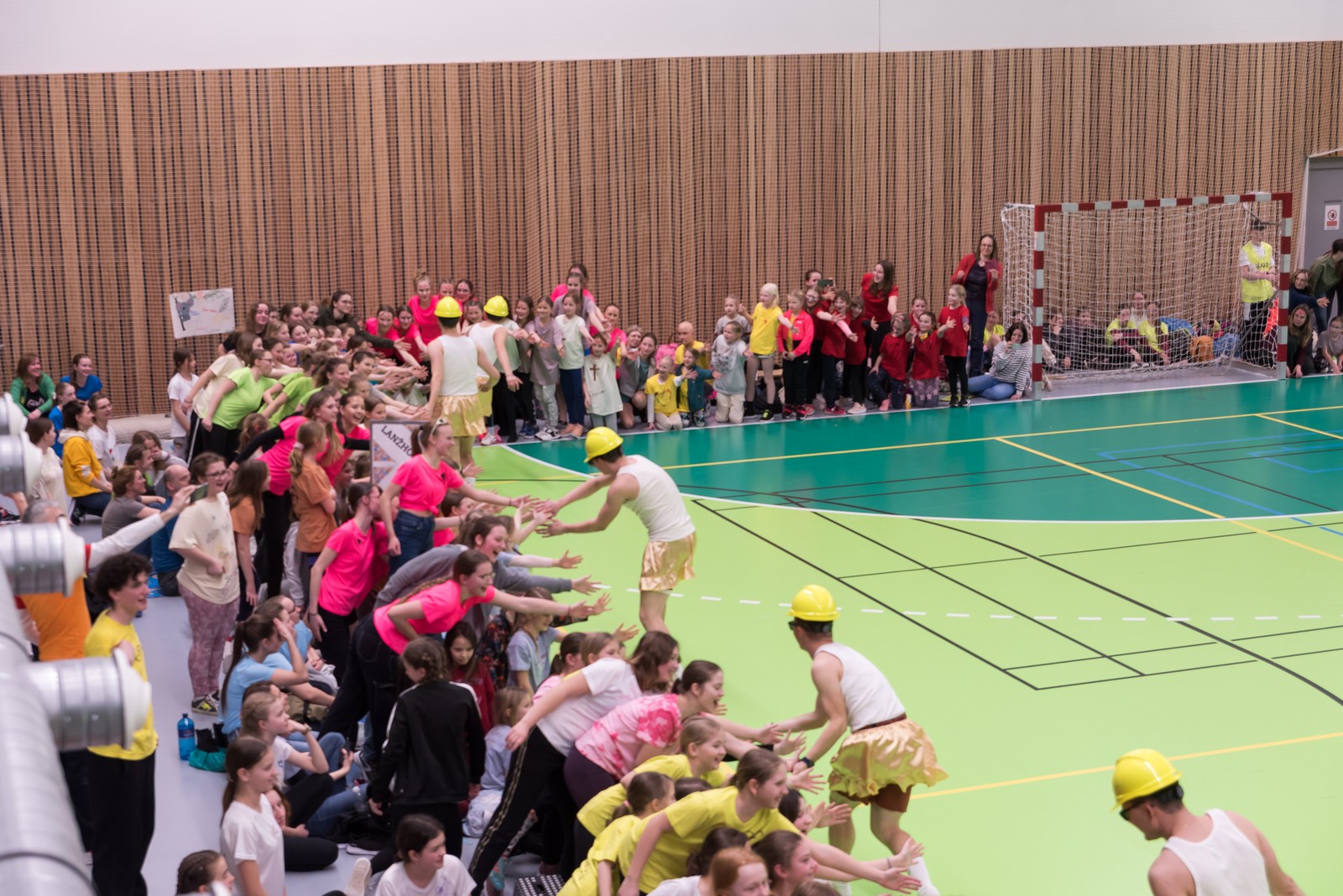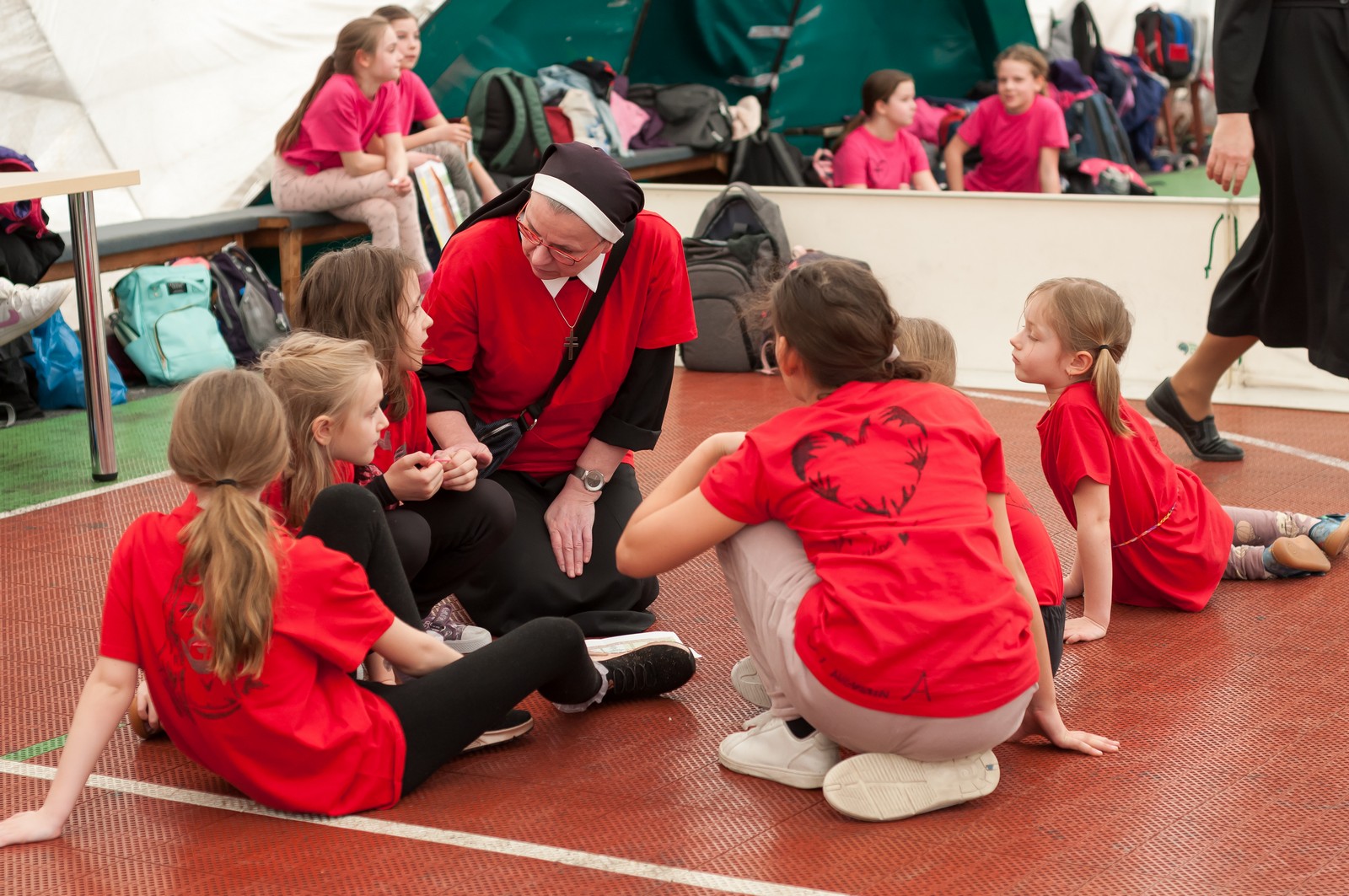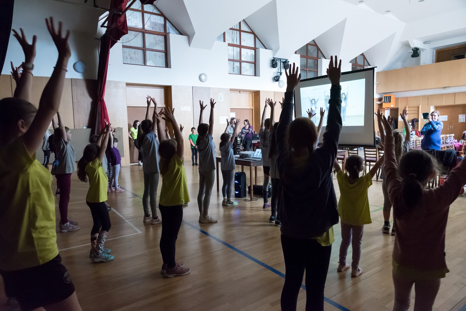 Na hrací plochu následně přišly mladé pardálky, aby zatancovaly svou verzi tance just dance, který si nacvičily během odpoledního programu v Měníně. Po nich své tance předvedla hromadně také děvčata obou zbývajících věkových kategorií, přičemž u tance nejmladších olympioniček byli na „taneční parket“ přivoláni také všichni přítomní, včetně kněží a řádových sester. Teď už snad tančila i hala za zvuku písničky: „Každý svůj pohyb dělám v Tobě, Ježíši“. Vytvořený lidský had neměl konce, radost tudy proudila na každém kroku…