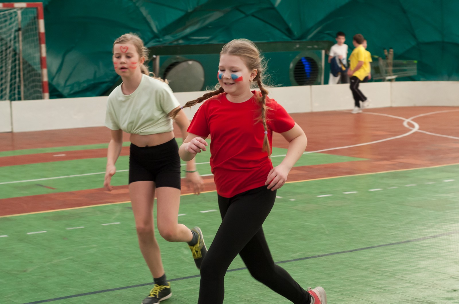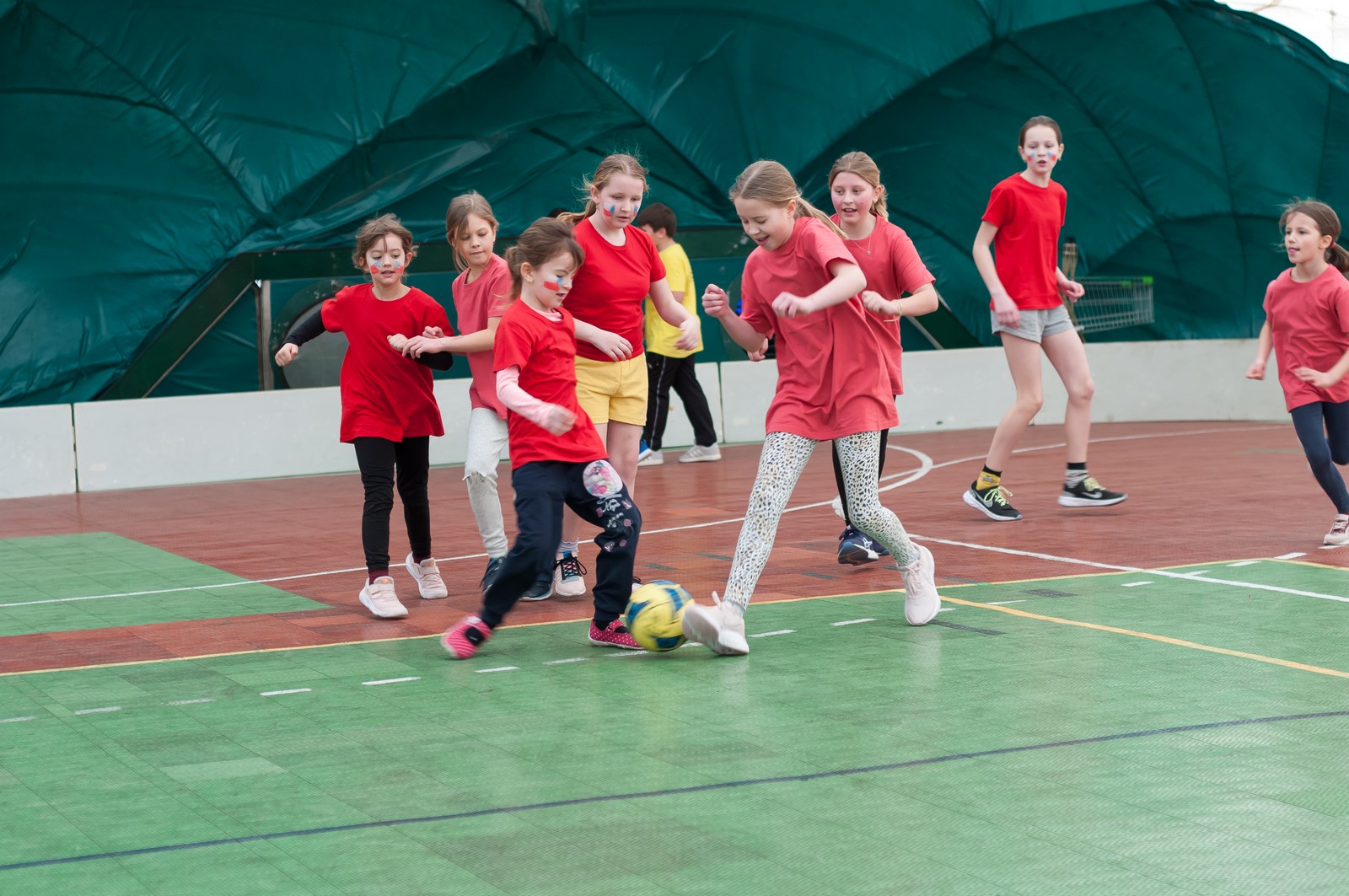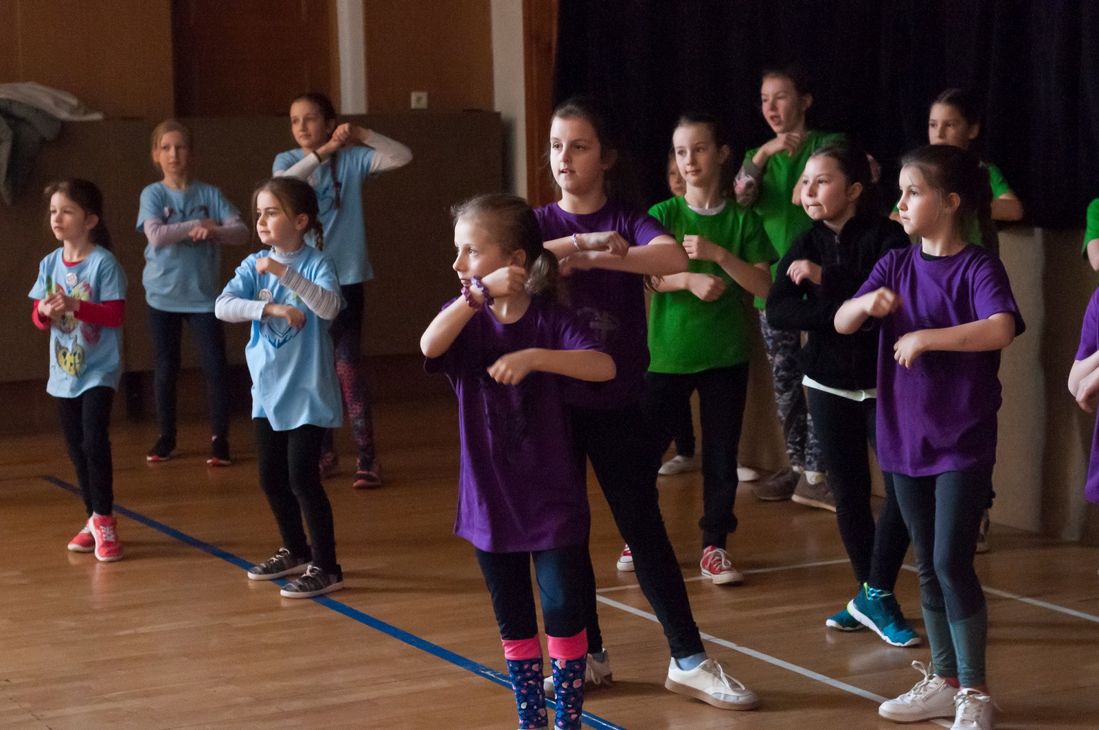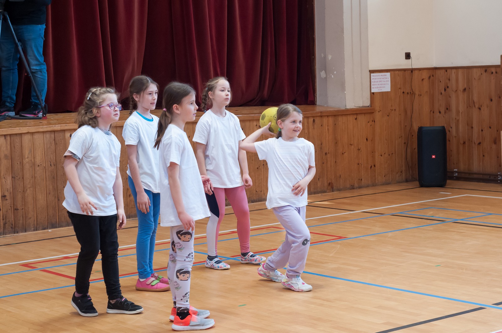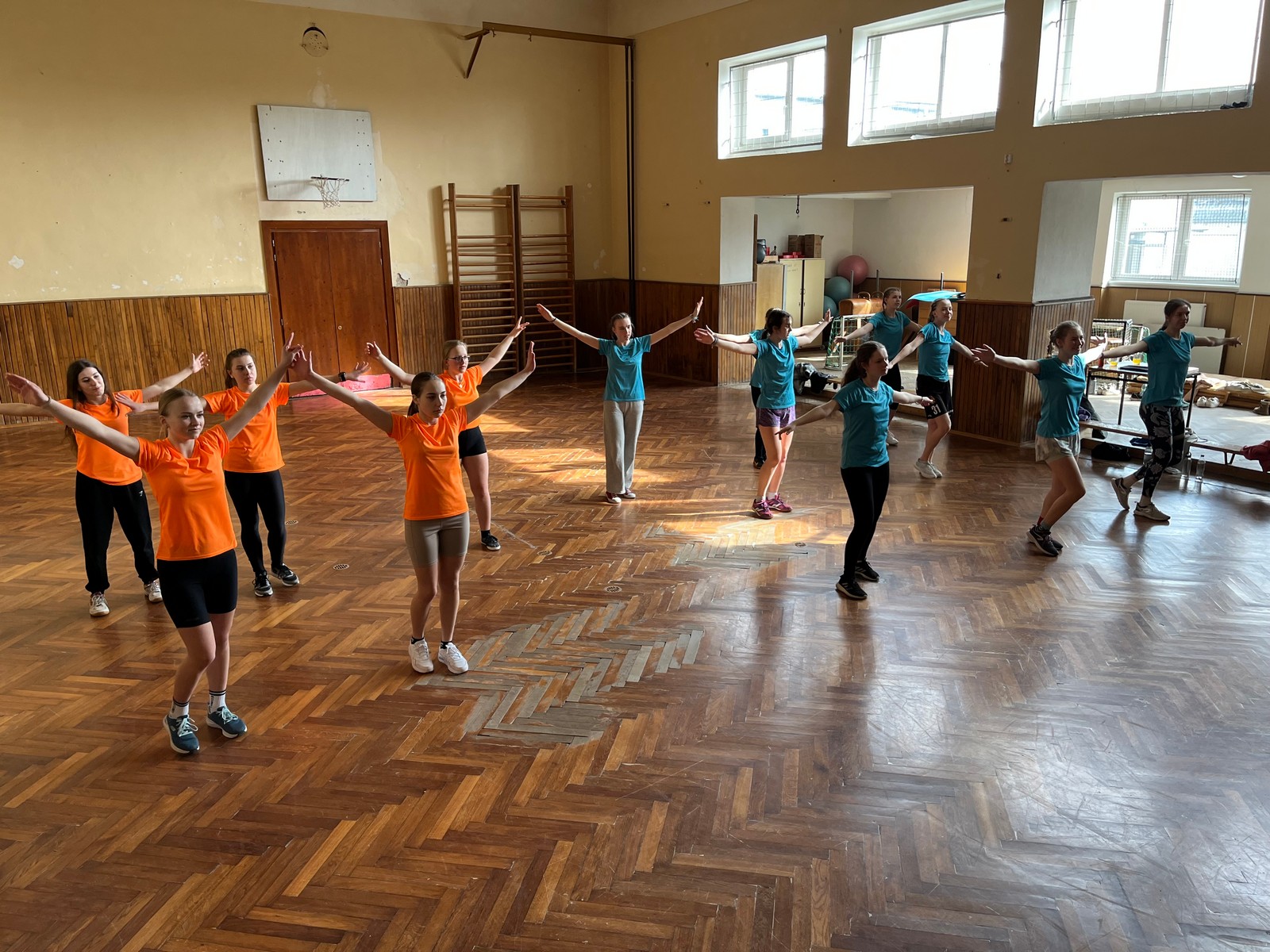 Na hrací plochu následně přišly mladé pardálky, aby zatancovaly svou verzi tance just dance, který si nacvičily během odpoledního programu v Měníně. Po nich své tance předvedla hromadně také děvčata obou zbývajících věkových kategorií, přičemž u tance nejmladších olympioniček byli na „taneční parket“ přivoláni také všichni přítomní, včetně kněží a řádových sester. Teď už snad tančila i hala za zvuku písničky: „Každý svůj pohyb dělám v Tobě, Ježíši“. Vytvořený lidský had neměl konce, radost tudy proudila na každém kroku…
