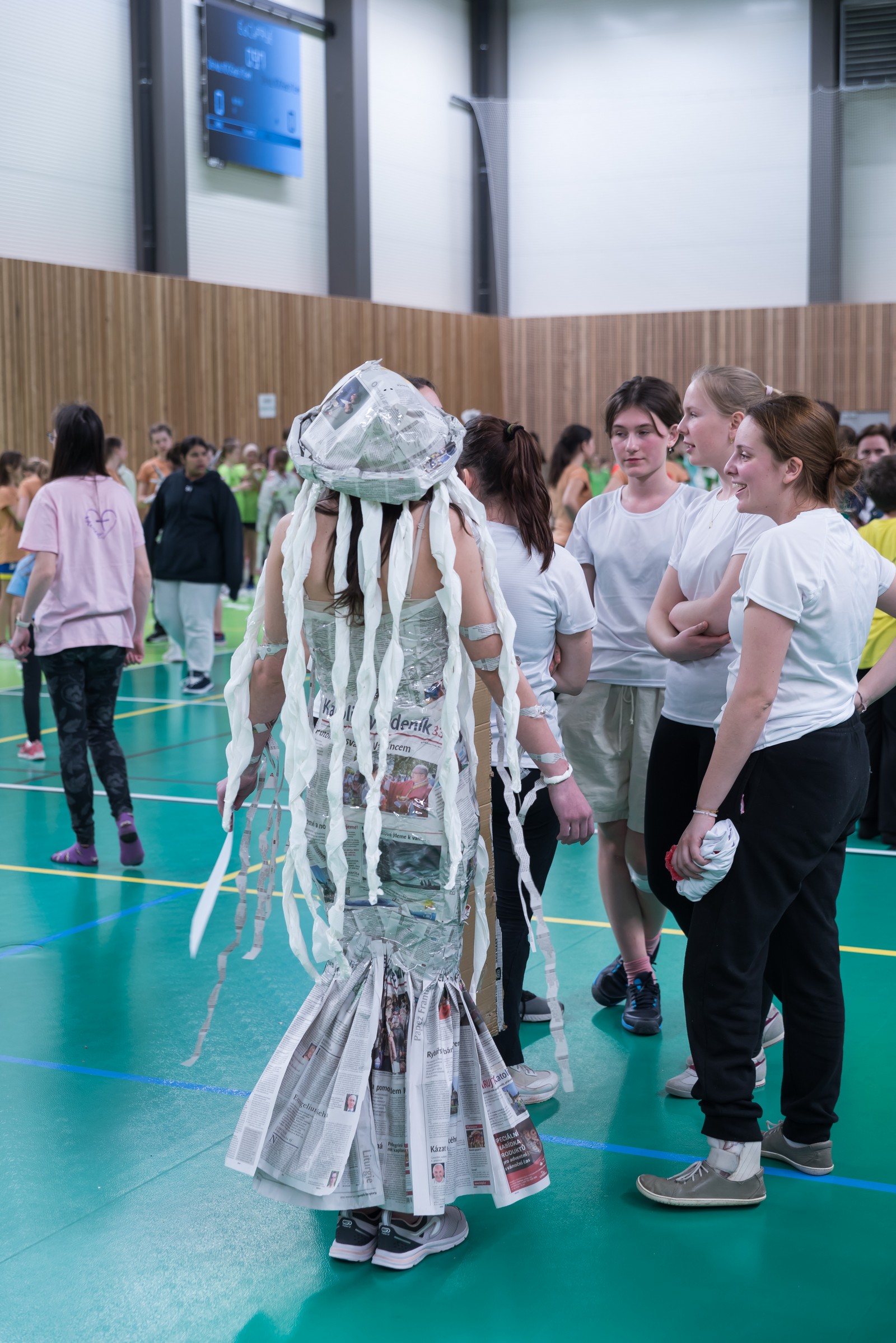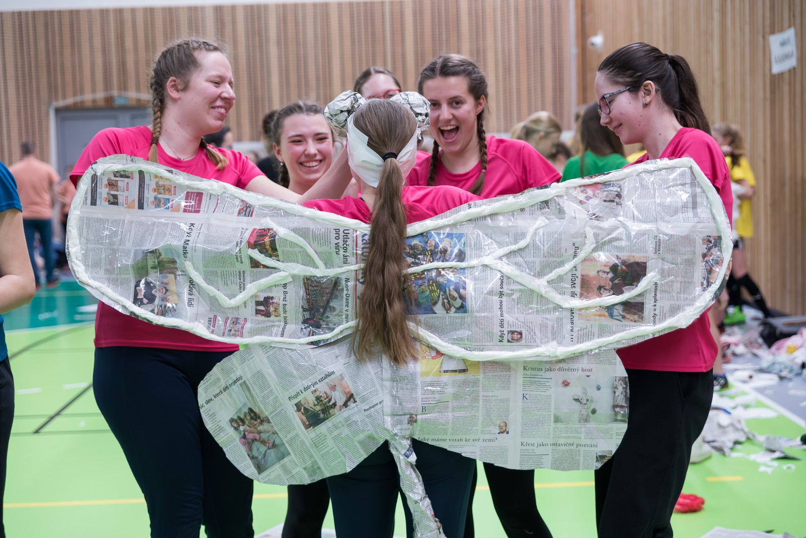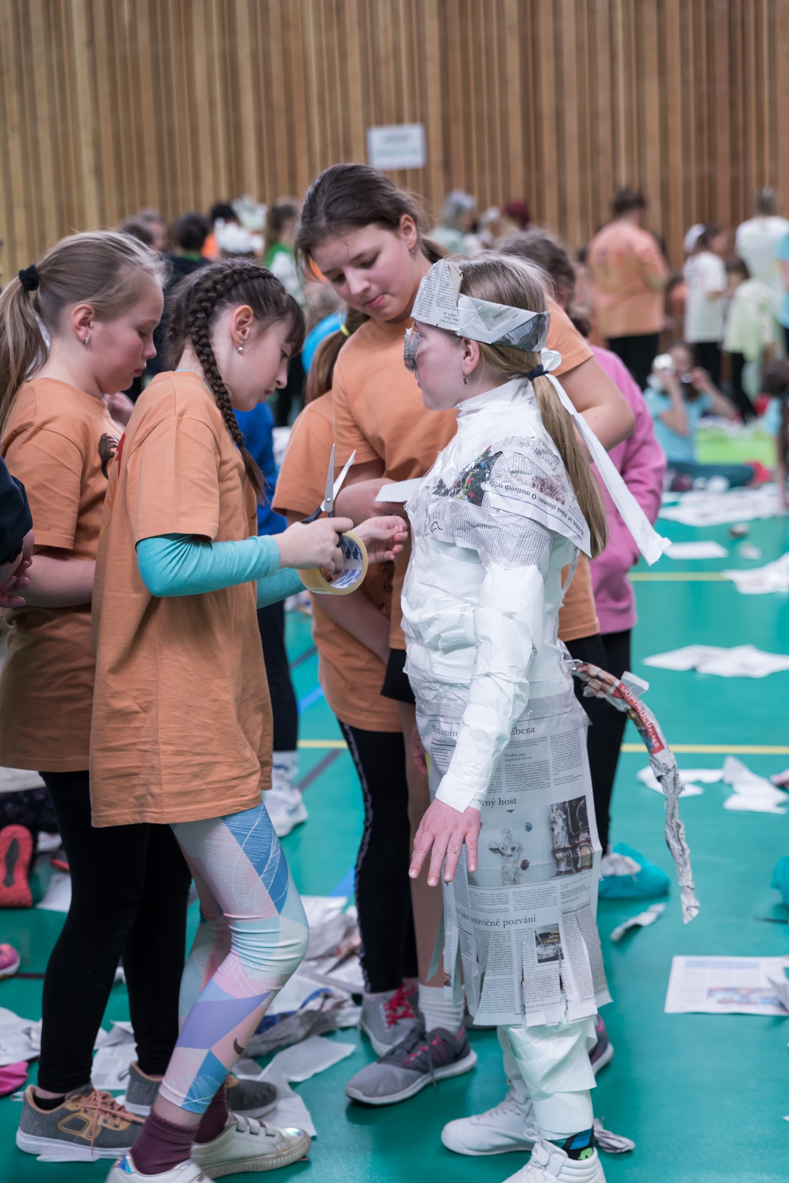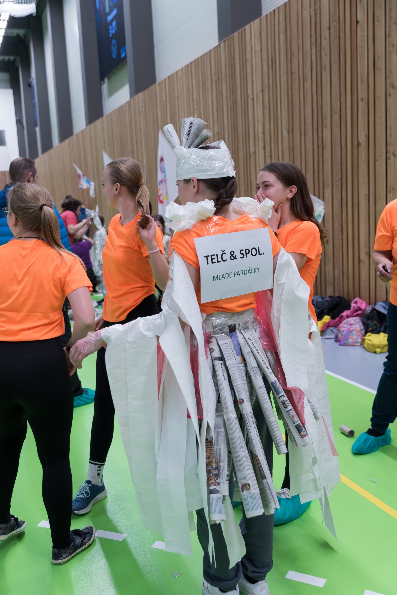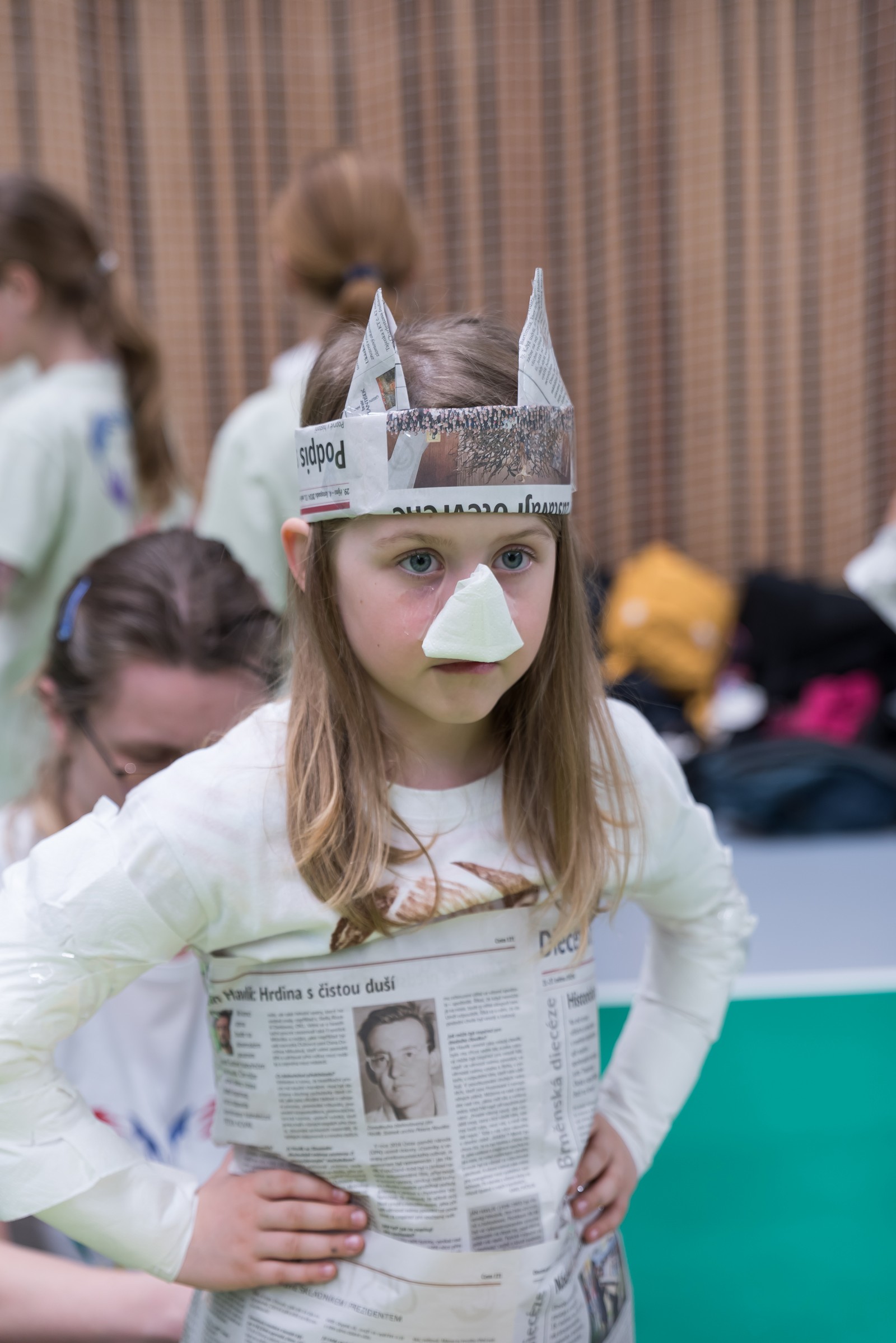 Pozitivní emoce však v tu chvíli bylo ještě třeba přetavit v kreativního ducha: všechny týmy dostaly do rukou sadu materiálů pro výrobu papírových kostýmů. Téma bylo zvoleno pro všechny stejné: zvířátka. Katolický týdeník, toaletní papír, izolepa, nůžky a 30 minut času. Děvčata se svého úkolu zhostila doslova fantasticky. Neopakovatelná umělecká díla si pak mohli prohlédnout nejen všichni přítomní soutěžící, ale i fanoušci a především odborná porota. Ta byla letos složena z těchto členů: P. Pavel Šenkyřík, biskupský vikářy pro pastoraci a vzdělávání, Lucie Šenkyříková z Katechetického centra Biskupství brněnského, místostarostka města Rajhrad Magda Mlejnková, měnínská katechetka Růženka Aujezdská a šéfredaktorka dívčího časopisu IN Marie Stejskalová. Bylo pro ně věru těžkým úkolem z nádherné zoologické zahrady vybrat ty nejlepší modely. Dalším nelehkým úkolem bylo ocenit nejkrásnější olympijské básničky, které děvčata skládala během celého olympijského dne. Za všechny můžeme citovat tuto poezii týmu II. stupně ZŠ Syrovice A: