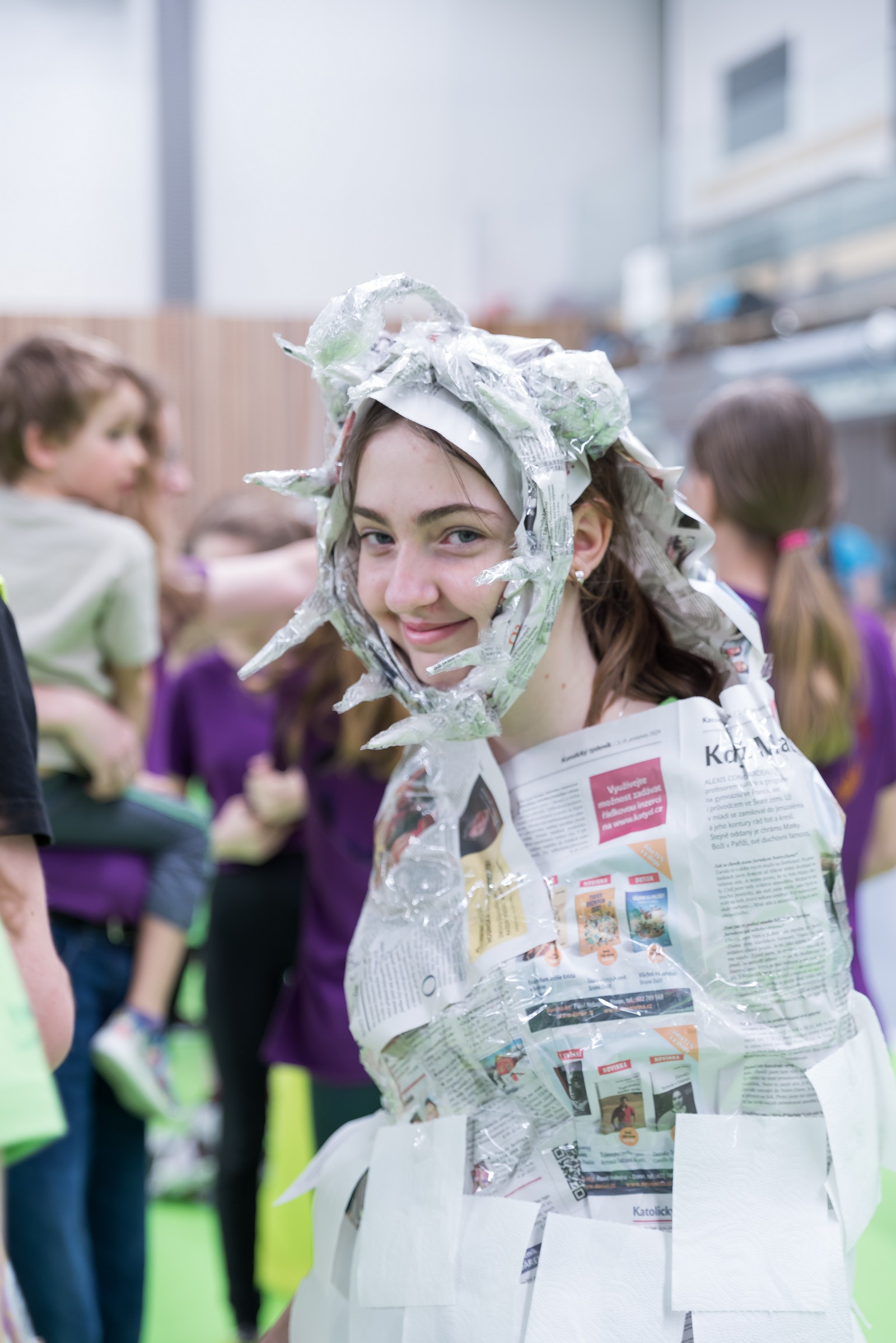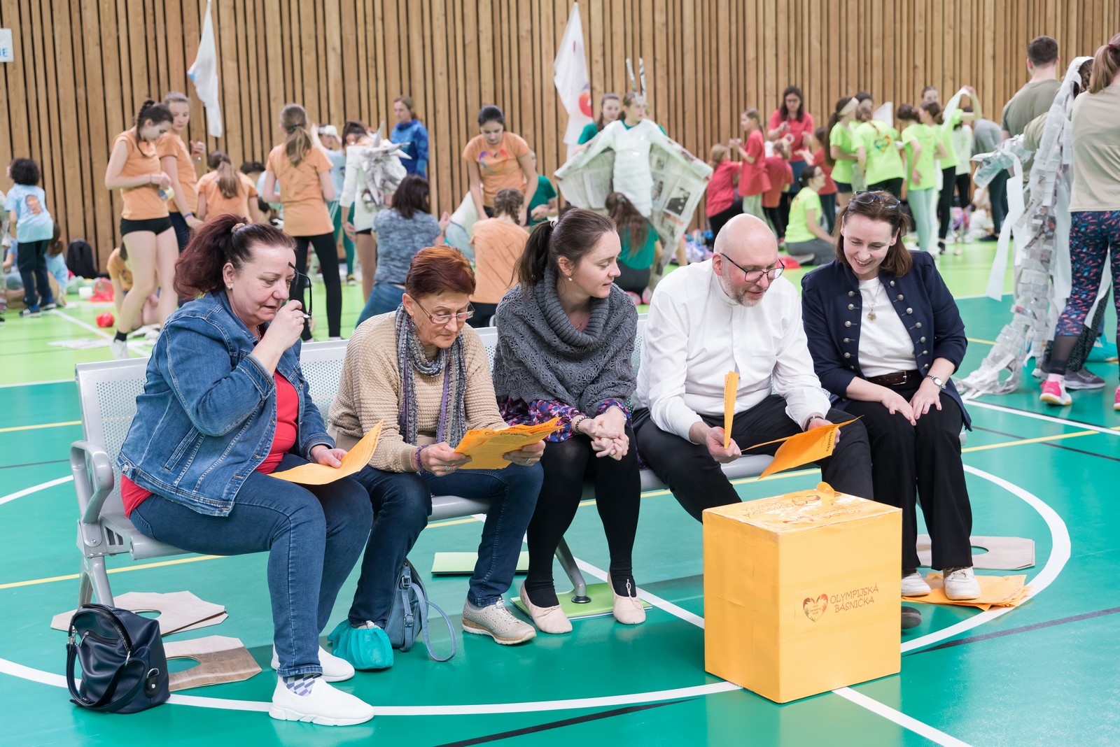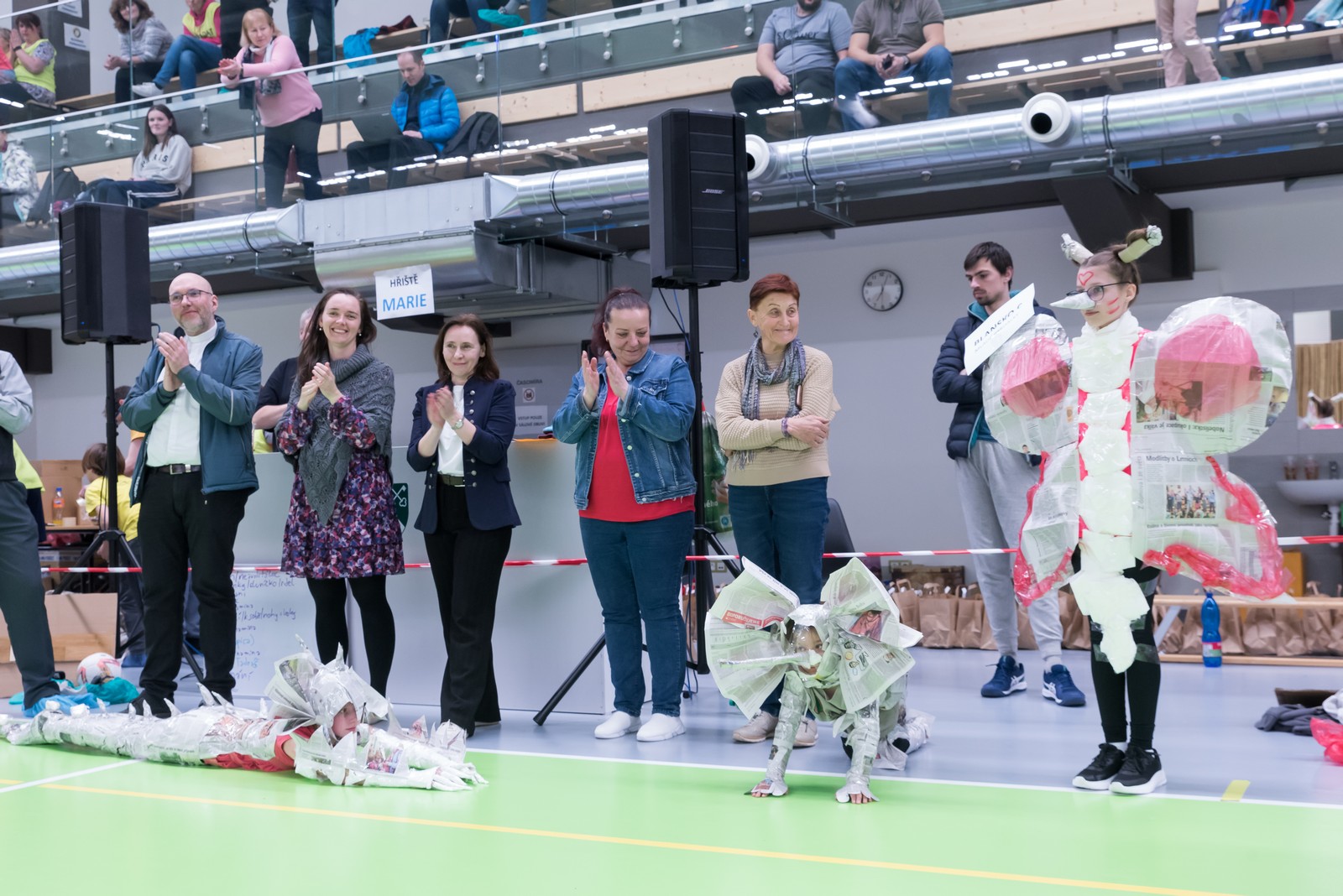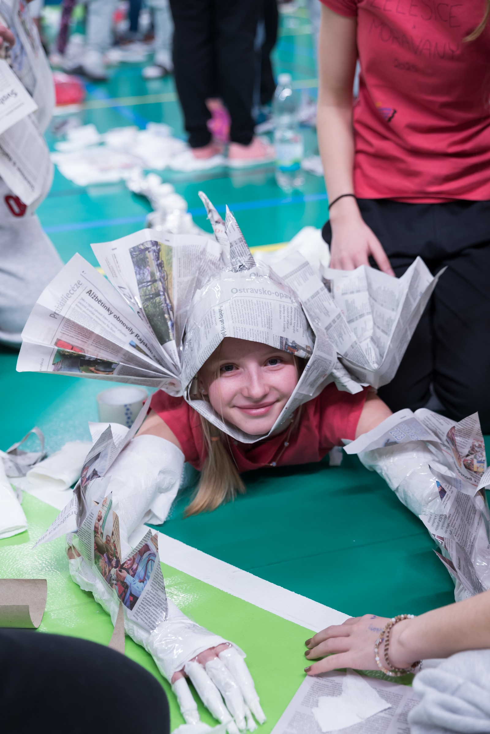 Pozitivní emoce však v tu chvíli bylo ještě třeba přetavit v kreativního ducha: všechny týmy dostaly do rukou sadu materiálů pro výrobu papírových kostýmů. Téma bylo zvoleno pro všechny stejné: zvířátka. Katolický týdeník, toaletní papír, izolepa, nůžky a 30 minut času. Děvčata se svého úkolu zhostila doslova fantasticky. Neopakovatelná umělecká díla si pak mohli prohlédnout nejen všichni přítomní soutěžící, ale i fanoušci a především odborná porota. Ta byla letos složena z těchto členů: P. Pavel Šenkyřík, biskupský vikářy pro pastoraci a vzdělávání, Lucie Šenkyříková z Katechetického centra Biskupství brněnského, místostarostka města Rajhrad Magda Mlejnková, měnínská katechetka Růženka Aujezdská a šéfredaktorka dívčího časopisu IN Marie Stejskalová. Bylo pro ně věru těžkým úkolem z nádherné zoologické zahrady vybrat ty nejlepší modely. Dalším nelehkým úkolem bylo ocenit nejkrásnější olympijské básničky, které děvčata skládala během celého olympijského dne. Za všechny můžeme citovat tuto poezii týmu II. stupně ZŠ Syrovice A: