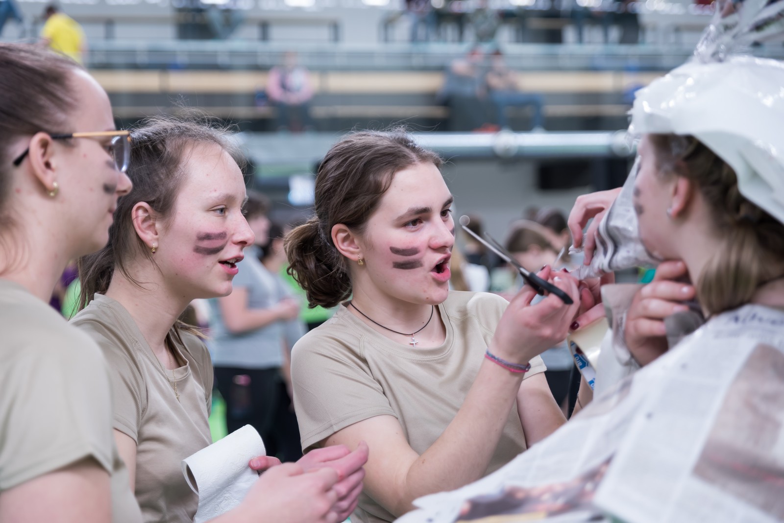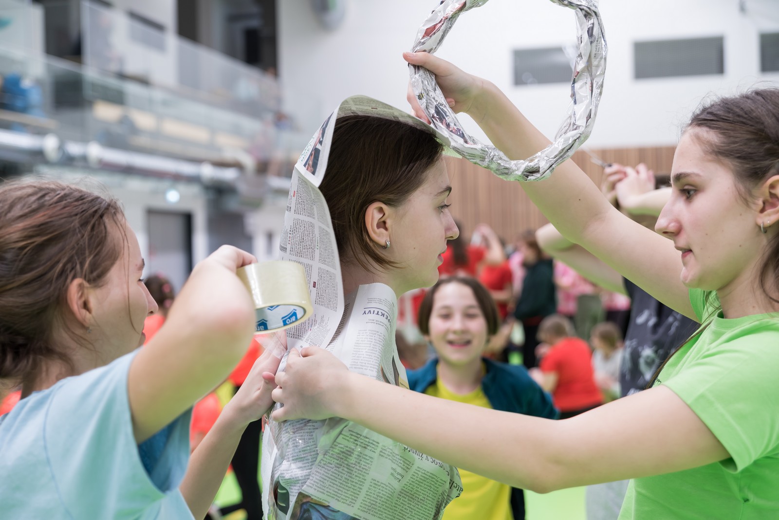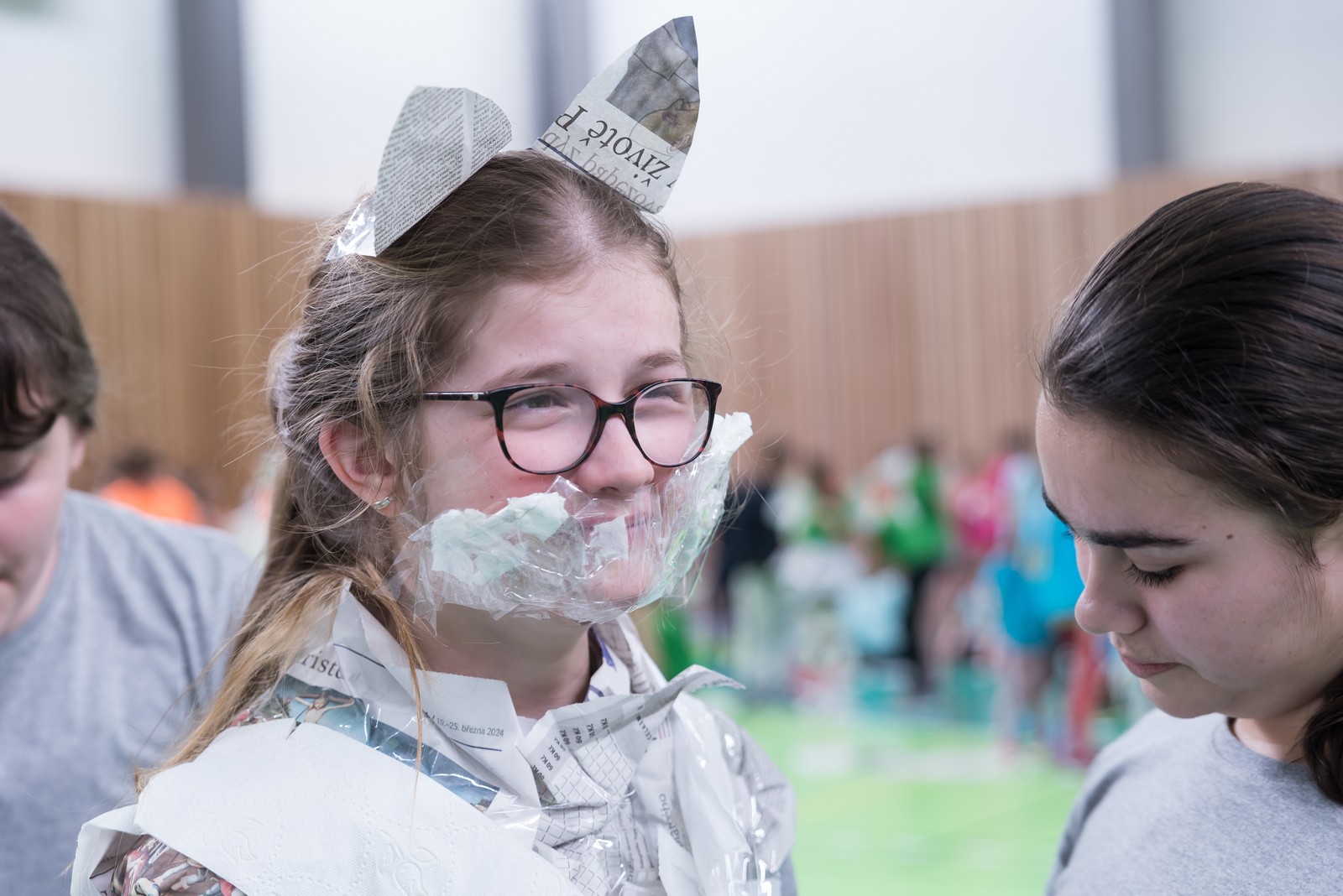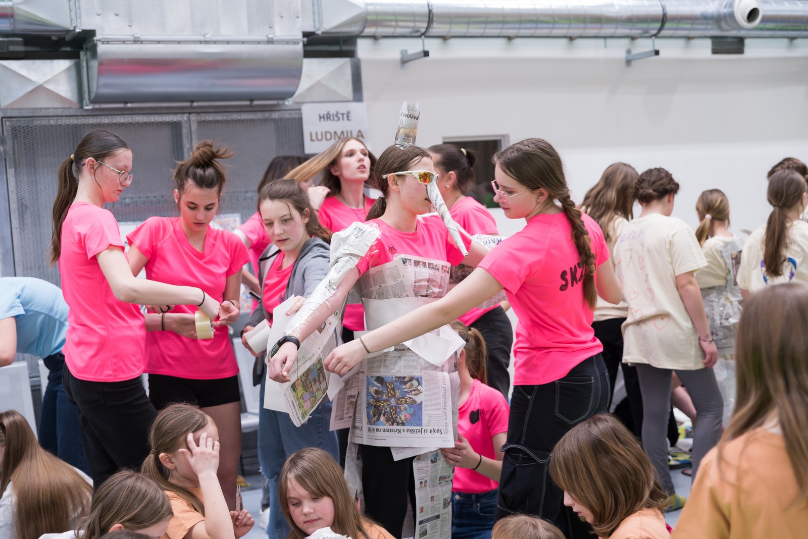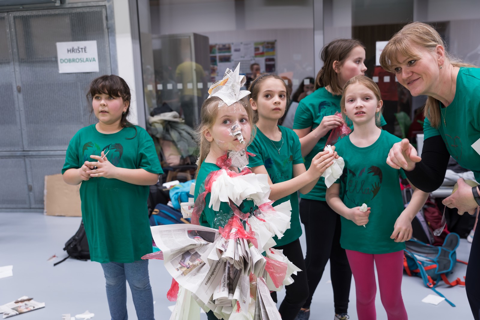 Pozitivní emoce však v tu chvíli bylo ještě třeba přetavit v kreativního ducha: všechny týmy dostaly do rukou sadu materiálů pro výrobu papírových kostýmů. Téma bylo zvoleno pro všechny stejné: zvířátka. Katolický týdeník, toaletní papír, izolepa, nůžky a 30 minut času. Děvčata se svého úkolu zhostila doslova fantasticky. Neopakovatelná umělecká díla si pak mohli prohlédnout nejen všichni přítomní soutěžící, ale i fanoušci a především odborná porota. Ta byla letos složena z těchto členů: P. Pavel Šenkyřík, biskupský vikářy pro pastoraci a vzdělávání, Lucie Šenkyříková z Katechetického centra Biskupství brněnského, místostarostka města Rajhrad Magda Mlejnková, měnínská katechetka Růženka Aujezdská a šéfredaktorka dívčího časopisu IN Marie Stejskalová. Bylo pro ně věru těžkým úkolem z nádherné zoologické zahrady vybrat ty nejlepší modely. Dalším nelehkým úkolem bylo ocenit nejkrásnější olympijské básničky, které děvčata skládala během celého olympijského dne. Za všechny můžeme citovat tuto poezii týmu II. stupně ZŠ Syrovice A: