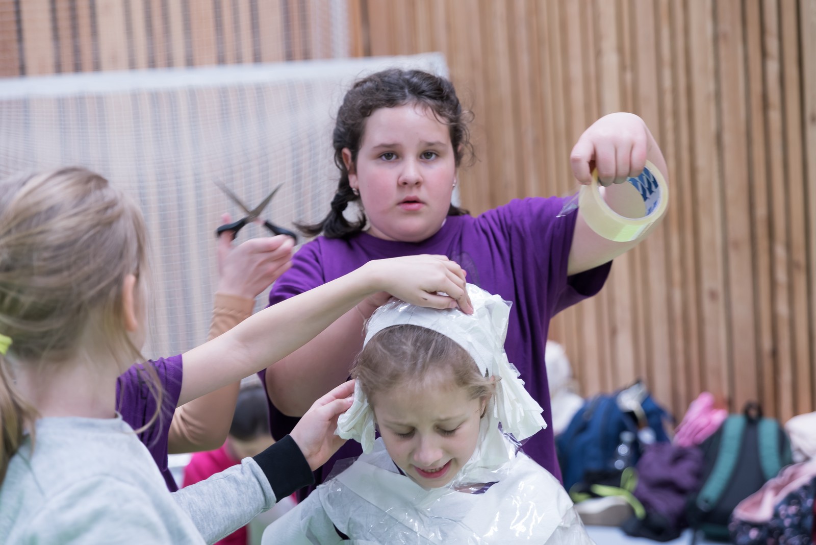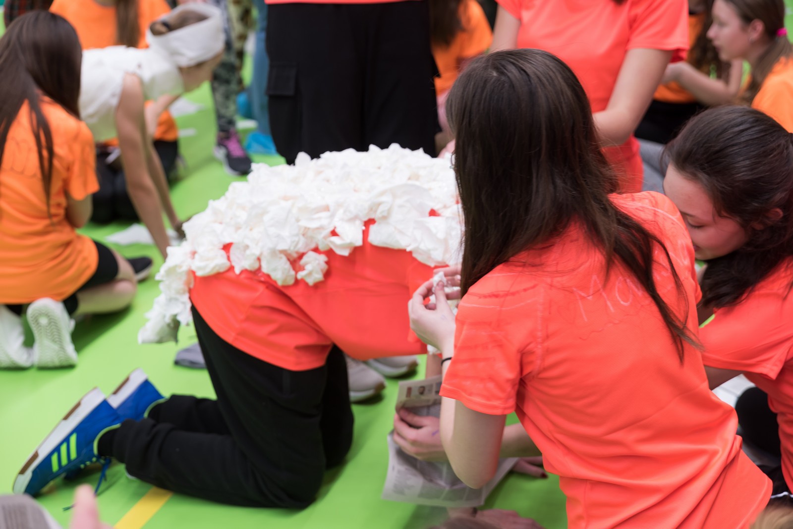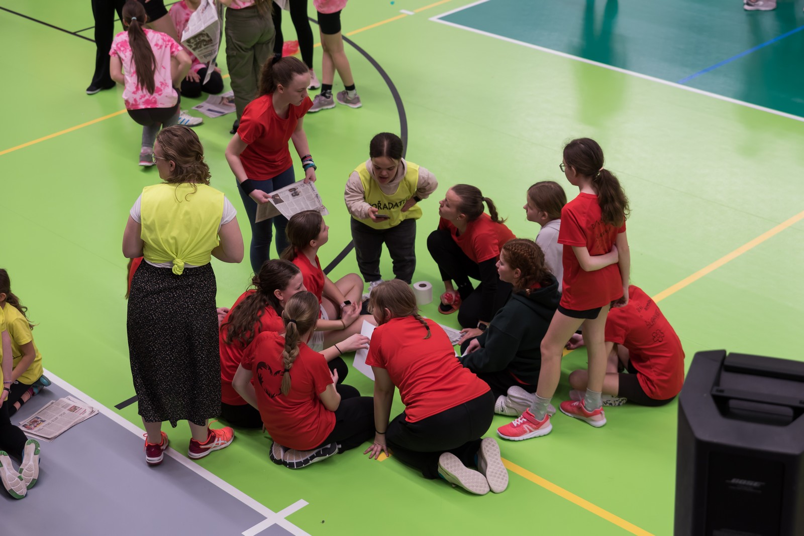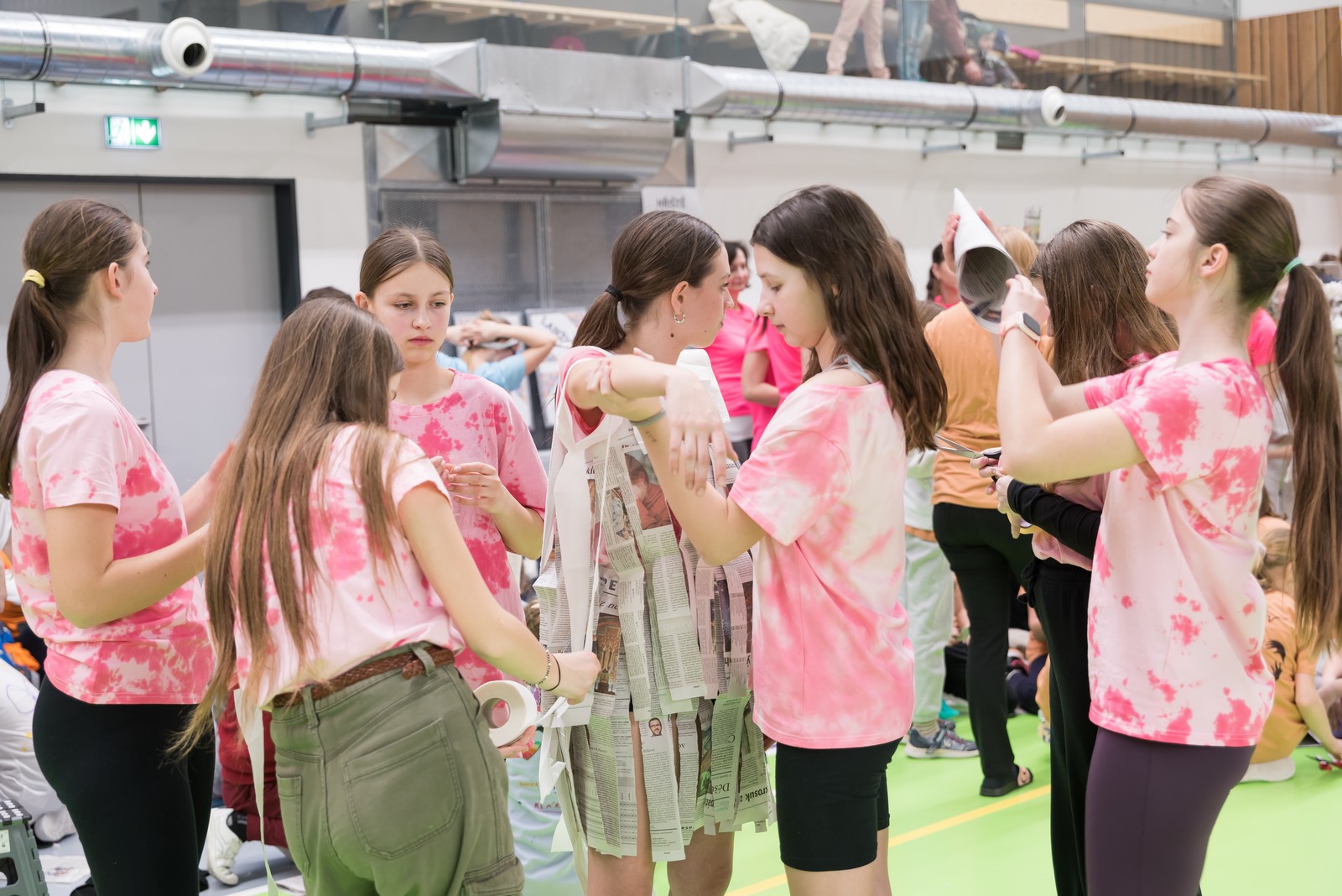 Pozitivní emoce však v tu chvíli bylo ještě třeba přetavit v kreativního ducha: všechny týmy dostaly do rukou sadu materiálů pro výrobu papírových kostýmů. Téma bylo zvoleno pro všechny stejné: zvířátka. Katolický týdeník, toaletní papír, izolepa, nůžky a 30 minut času. Děvčata se svého úkolu zhostila doslova fantasticky. Neopakovatelná umělecká díla si pak mohli prohlédnout nejen všichni přítomní soutěžící, ale i fanoušci a především odborná porota. Ta byla letos složena z těchto členů: P. Pavel Šenkyřík, biskupský vikářy pro pastoraci a vzdělávání, Lucie Šenkyříková z Katechetického centra Biskupství brněnského, místostarostka města Rajhrad Magda Mlejnková, měnínská katechetka Růženka Aujezdská a šéfredaktorka dívčího časopisu IN Marie Stejskalová. Bylo pro ně věru těžkým úkolem z nádherné zoologické zahrady vybrat ty nejlepší modely. Dalším nelehkým úkolem bylo ocenit nejkrásnější olympijské básničky, které děvčata skládala během celého olympijského dne. Za všechny můžeme citovat tuto poezii týmu II. stupně ZŠ Syrovice A: