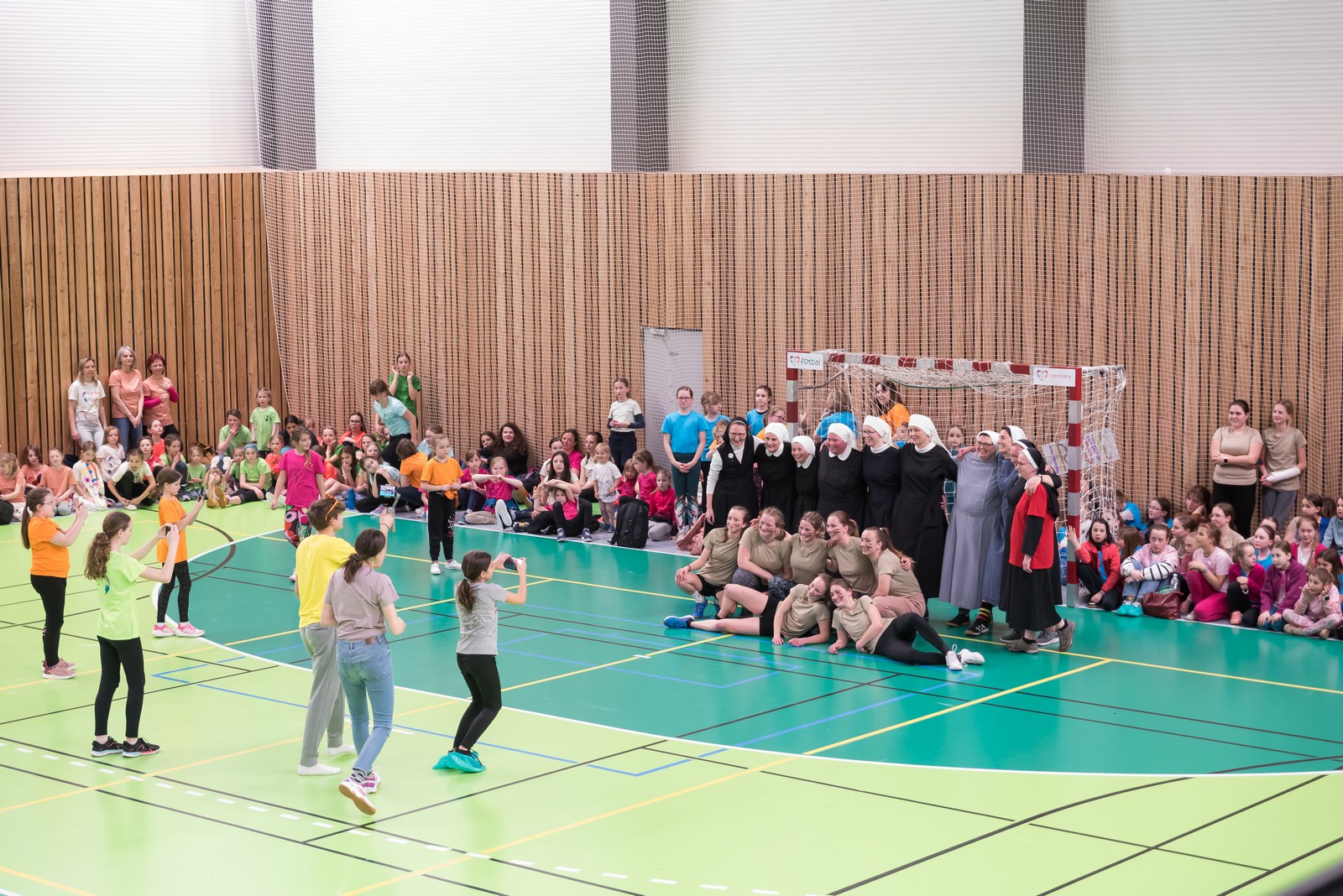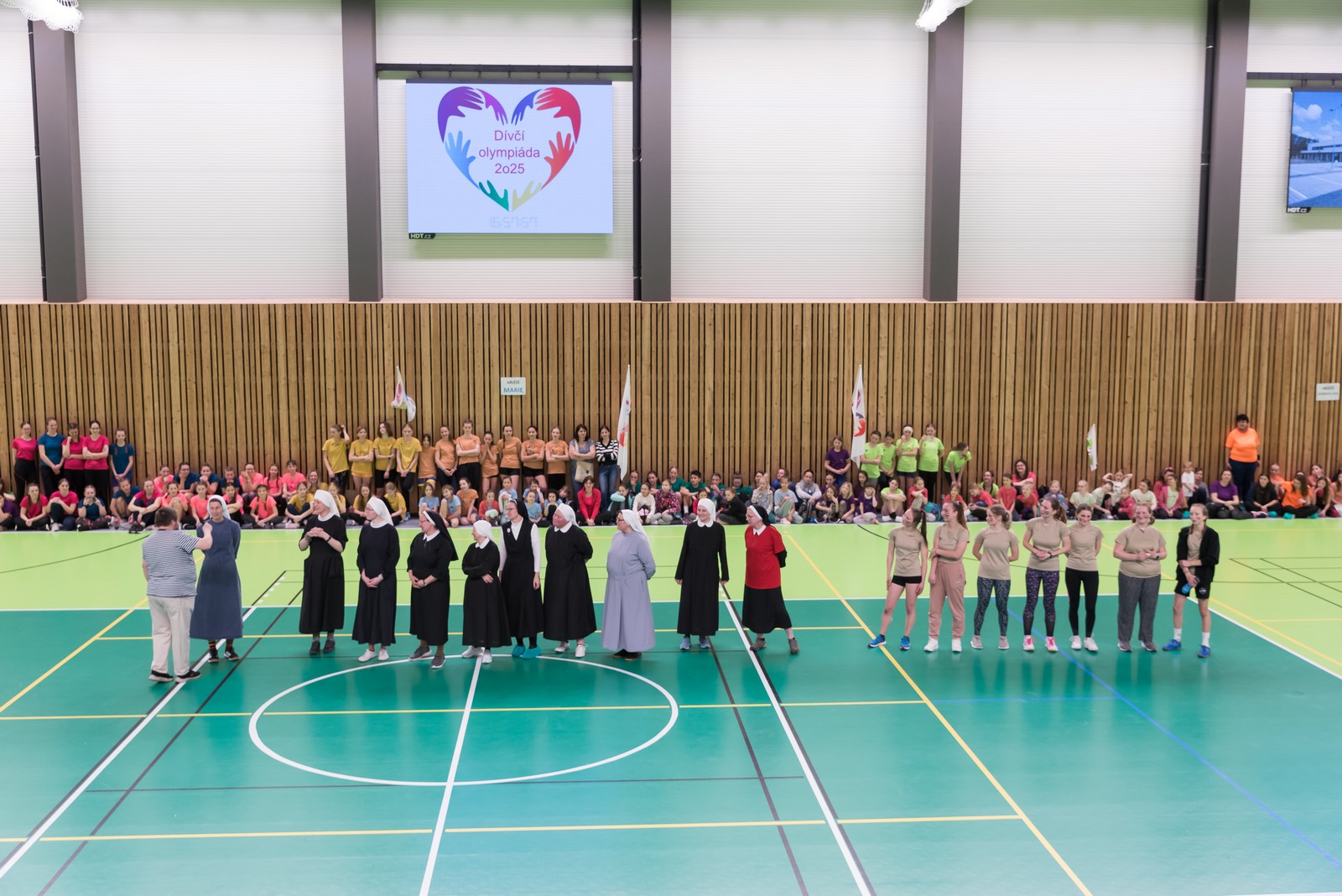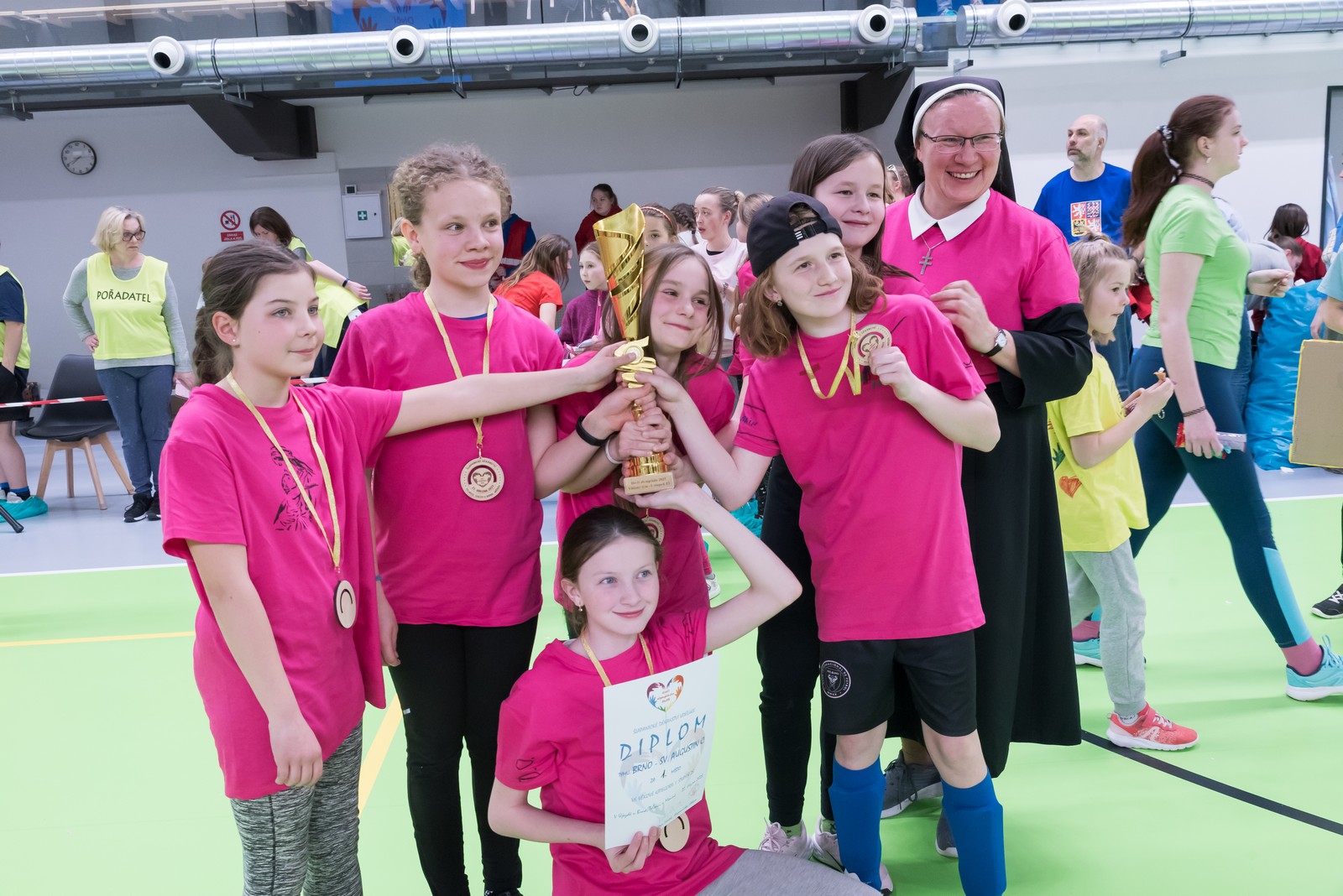K vrcholu celého olympijského dne se pak všichni sjeli do sportovní haly v Újezdě u Brna, kde je čekal gala finálový program. Úvod obstarali telničtí ministranti, kteří sebrali odvahu a zatančili před celkem osm stovkami bouřících diváků své veselé vystoupení. To však byla jen předehra „Sestrám v akci“, tedy exhibičnímu fotbalovému zápasu mezi řeholními sestrami a nejlepšími fotbalistkami z řad mladých pardálek – tedy děvčat ze Šaratic. Výsledek 3:3 byl k oběma týmům spravedlivý, publikum hlasitě povzbuzovalo, hala se otřásala nadšeným povzbuzováním.