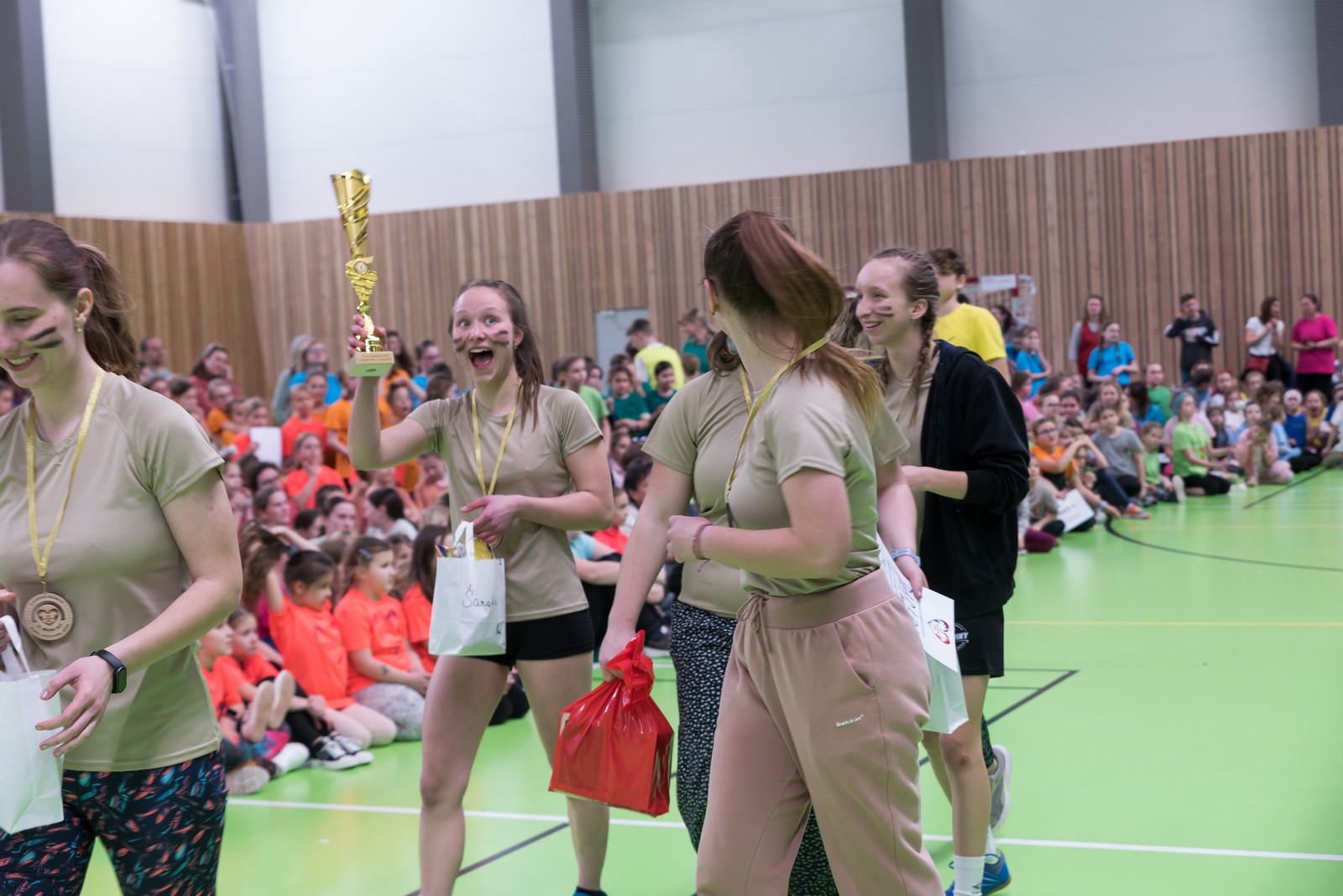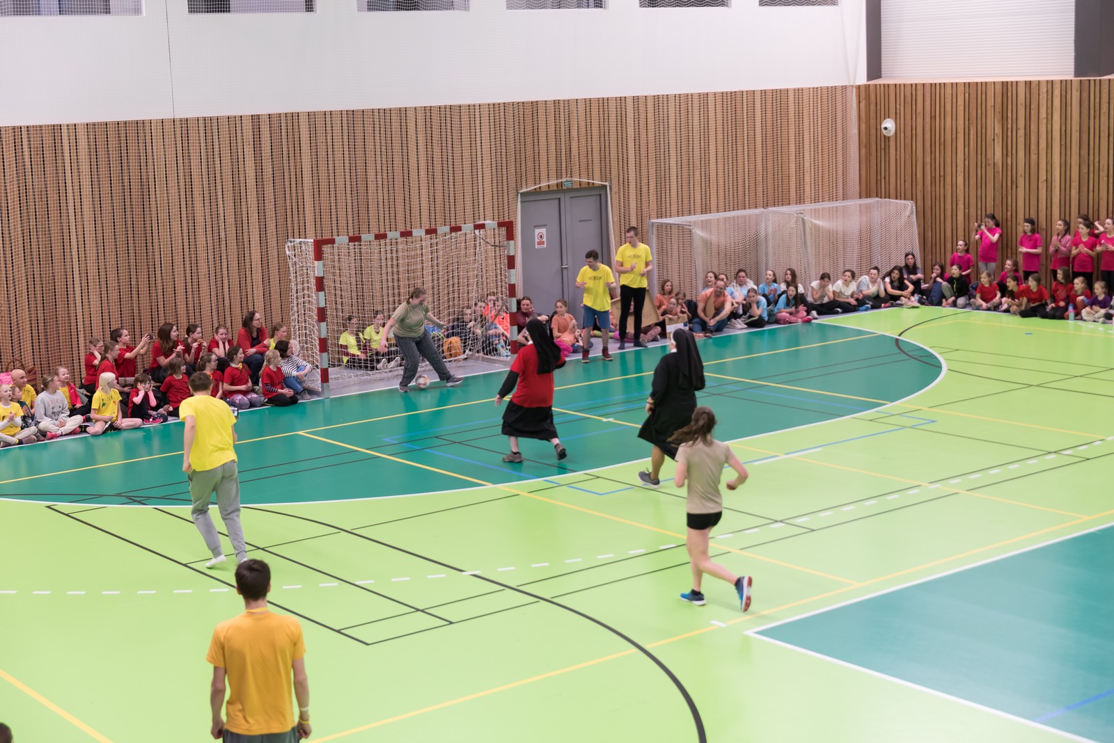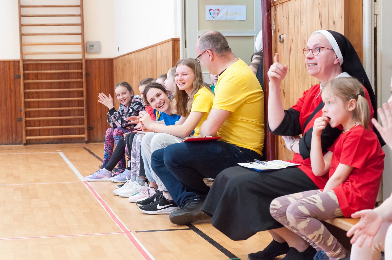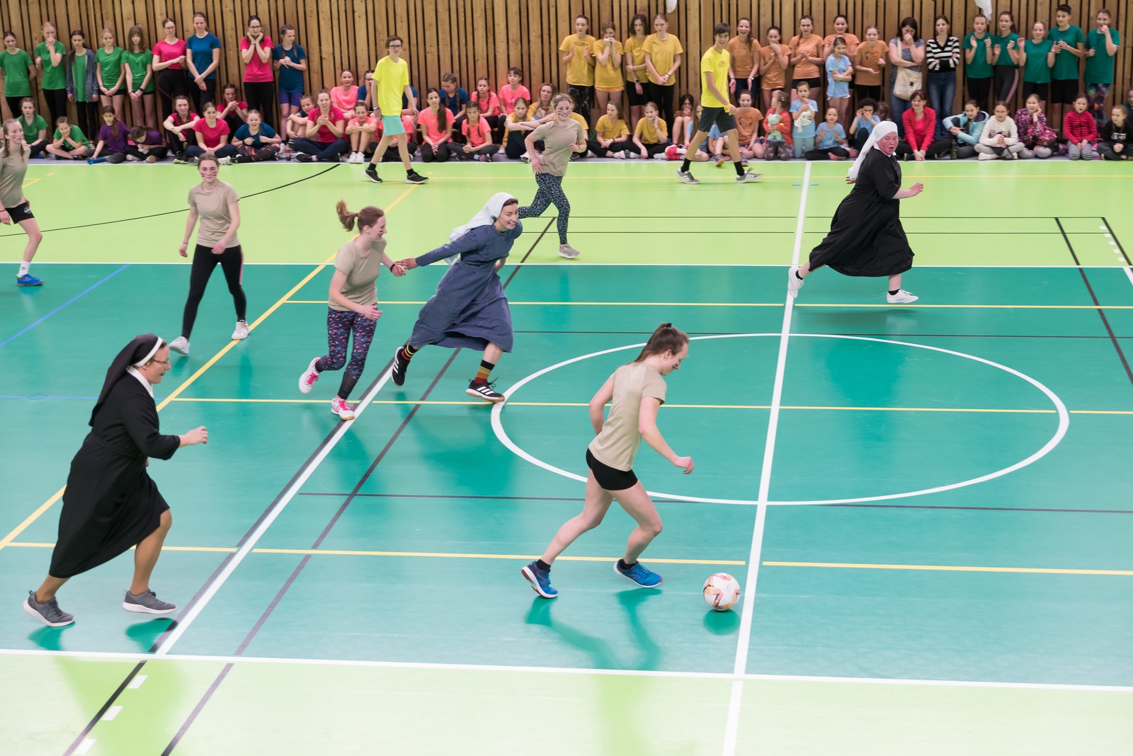 K vrcholu celého olympijského dne se pak všichni sjeli do sportovní haly v Újezdě u Brna, kde je čekal gala finálový program. Úvod obstarali telničtí ministranti, kteří sebrali odvahu a zatančili před celkem osm stovkami bouřících diváků své veselé vystoupení. To však byla jen předehra „Sestrám v akci“, tedy exhibičnímu fotbalovému zápasu mezi řeholními sestrami a nejlepšími fotbalistkami z řad mladých pardálek – tedy děvčat ze Šaratic. Výsledek 3:3 byl k oběma týmům spravedlivý, publikum hlasitě povzbuzovalo, hala se otřásala nadšeným povzbuzováním.
