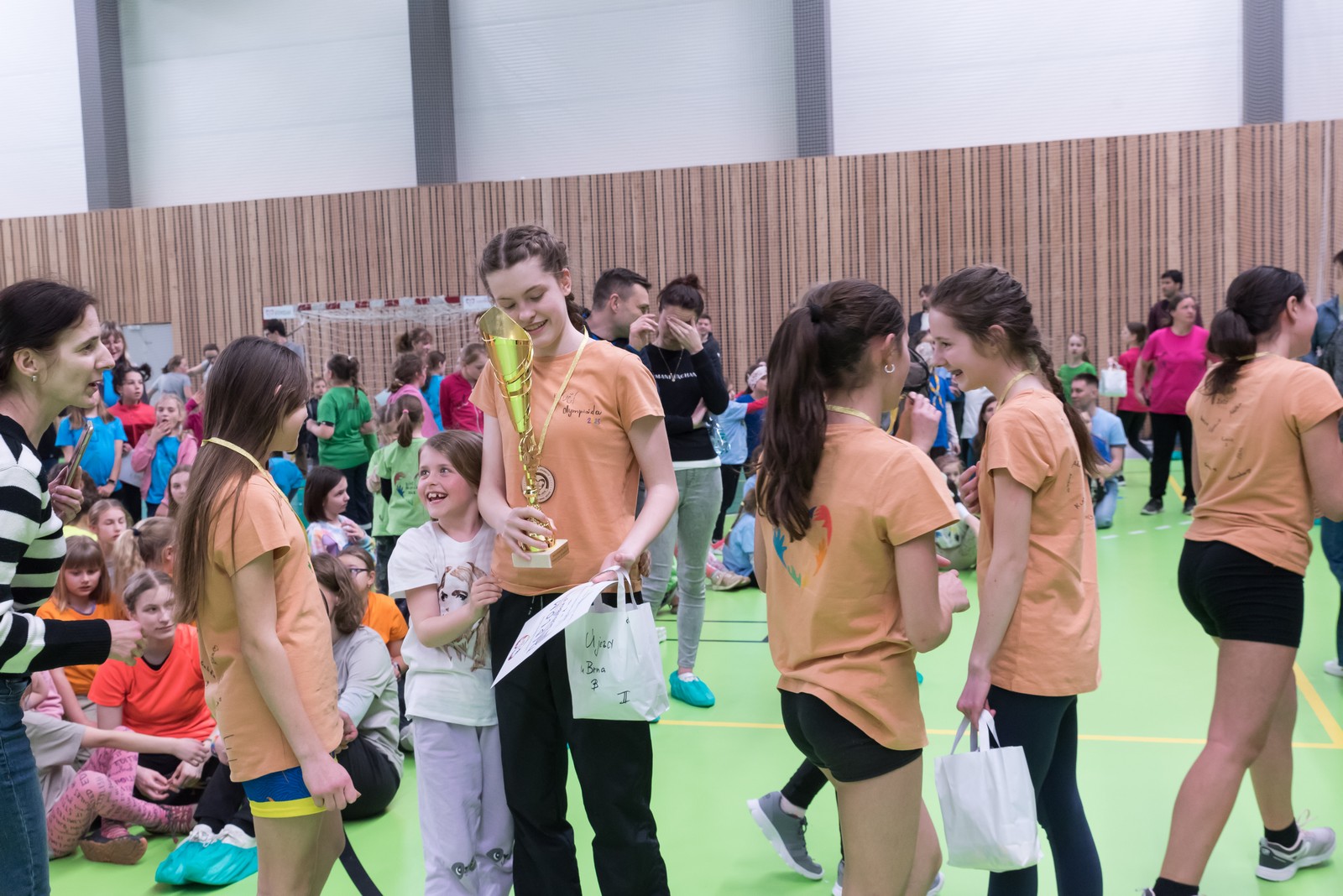 Po celodenním bohatém programu přišlo na řadu vyhlašování výsledků, kterého se ujali členové poroty, ale také šlapanický děkan P. Petr Hošek (jménem pořádajícího děkanství) a P. Jiří Janoušek ze Slavkova u Brna. Poháry a medaile si na prvním stupni ZŠ odvezly tyto týmy: 1. Brno – Sv. Augustin C, 2. Bystřice nad Pernštejnem B a 3. Šlapanice A. Na druhém stupni ZŠ pak: 1. Újezd u Brna, 2. Moravany – Želešice B a 3. Pozořice C. V nejstarší věkové kategorii uspěly mladé pardálky ze Šaratic, druhé místo získaly holky z Blanska C a bronzové byly Syrovice C. I když vyhlašování výsledků doprovázela ohromná radost, přesto si odměnu zasloužil každý tým, který dorazil a vytvořil tu báječnou přátelskou atmosféru. Všechny olympioničky pak společně naplnily slova písničky, která na úvod zazněla v chrámu sv. Jana Křtitele v Telnici: „Raduj se v Pánu vždycky, tobě pravím raduj se!“.