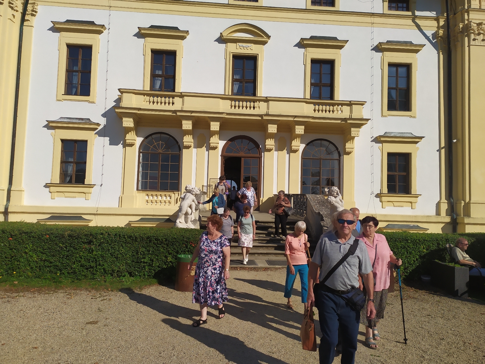 Naše další cesta směřovala do Slavkova u Brna, kde jsme po společném obědě navštívili místní hřbitov s krásnou barokní kaplí sv. Jana Křtitele. Naše kroky směřovaly do centra města ke zdejšímu farnímu kostelu Vzkříšení Páně. Původně byl ve městě gotický kostel sv. Jakuba. V polovině 18. století se však kostel částečně sesunul, a proto byl celý zbořen a na konci 18. století vystavěn zcela nový chrám na jiném místě pod zámkem. Nový kostel byl postaven podle projektu vídeňského architekta Jan Ferdinand Hetzendorf z Hohenbergu. Před hlavním vchodem se nachází předsíň se šesti sloupy s korintskými hlavicemi, které nesou biblický reliéf Rozeslání apoštolů. Pěkné reliéfy jsou k vidění i v chrámovém interiéru: např. motiv Vzkříšení Páně a Archa úmluvy nad hlavním oltářem, Křtu Páně či Poslední večeře Páně. Hlavní oltář a dva boční oltáře jsou vystavěny z červeného mramoru. Při novém liturgickém uspořádání byl interiér kostela doplněn oltářem z bílého mramoru a slavnostně vysvěcen 16. října 1986. Při příchodu do tohoto nádherného kostela přestanete málem dýchat, protože bílá výmalba kostela a monumentální sochařská výzdoba v člověku zanechávají nezapomenutelný zážitek. Náš pan farář v tomto kostele před lety přijal svátost křtu, první svaté přijímání, biřmování, pravidelně ministroval i sloužil v roce 2004 primiční mši svatou. Každému, kdo v tomto nádherném chrámu ještě nebyl, vřele doporučuji, aby si sem udělal malý výlet. Jistě každý ocení zručnost starých mistrů různých řemesel, kteří vlastníma rukama dokázali vytvořit tolik nádhery. Plni zážitků jsme si někteří ještě udělali krátký výlet po zámeckém parku a po památkách na náměstí.