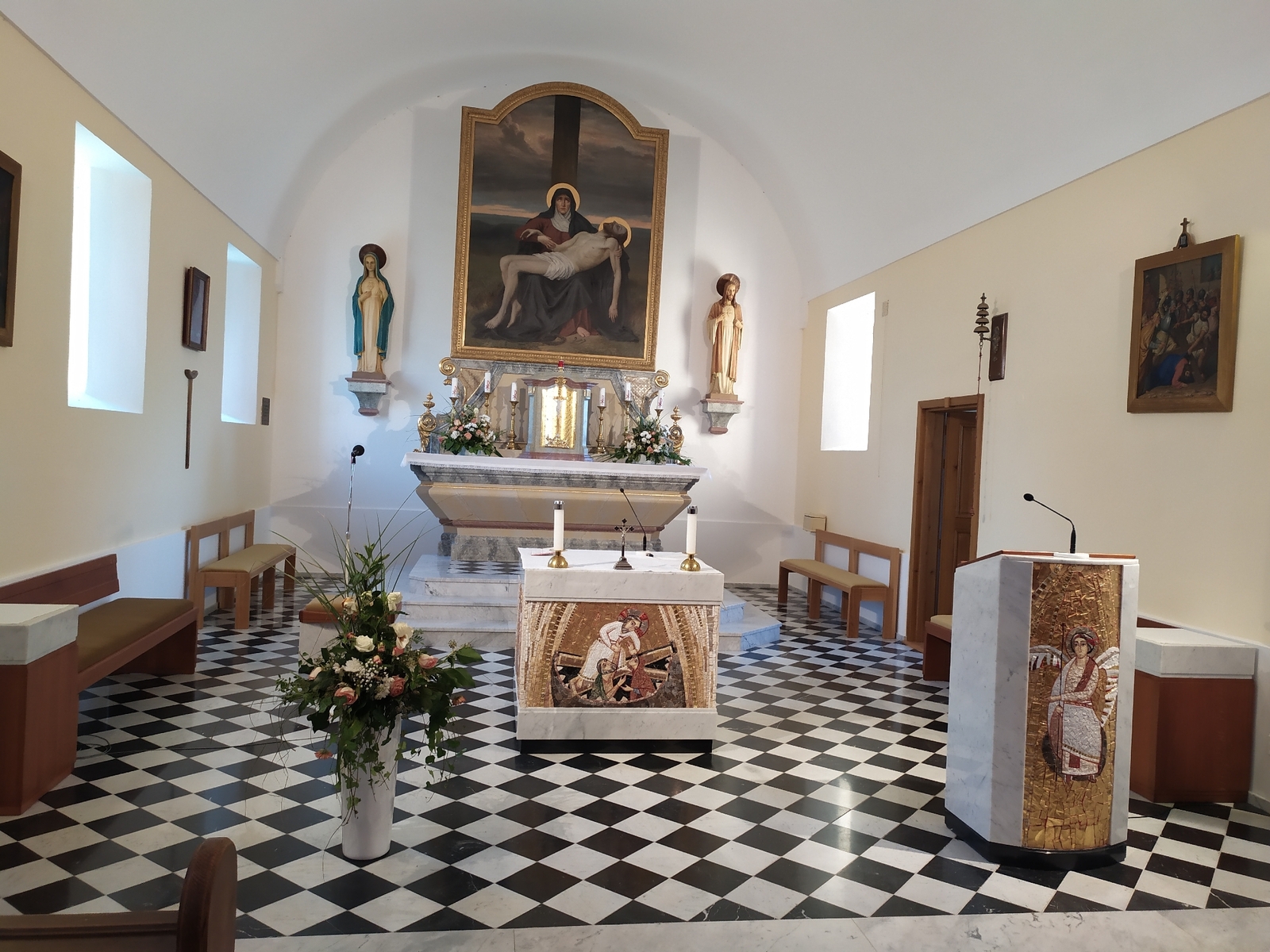 První zastávkou na naší pouti byl tedy Rousínovec, který je dnes součástí města Rousínova a v jehož kostele sv. Václava sloužil mši svatou otec Oldřich Chocholáč. Právě v této farnosti kdysi sám „kaplanoval“. Po mši svaté jsme nasedli do autobusu a jeli na plánovanou prohlídku poutního místa Lutršték, které se nachází poblíž vesnice Němčany. Nejdříve jsme se zastavili u studánky s léčivou vodou, která dle pověstí uzdravila několik slepých lidí a pomohla i bolavým kloubům. Nad studánkou se nachází malá kaple se sochou Panny Marie Sedmibolestné, jak na svém klíně třímá svého syna Ježíše Krista. Z darů poutníků bylo v roce 1867 kousek nad studánkou započato se stavbou poutní kaple, která byla dokončena a slavnostně vysvěcena v roce 1877. My jsme se tu pomodlili litanie za nás poutníky, naše blízké, za farnost a mír ve světě.